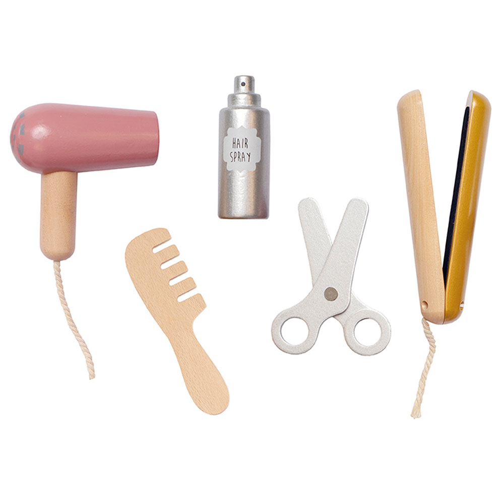 Nu kan du äntligen öppna din egen lilla frisörsalong hemma! Med vårt charmiga frisörset finns allt du behöver för att klippa och styla olika roliga frisyrer. Klipp, föna och platta – bara fantasin sätter gränser för vilka tokiga eller snygga frisyrer du kan skapa. Med vårt frisörset blir du snabbt ett proffs på att klippa hår. Bältet har ett kardborrband som enkelt fästs runt höften, och sedan är du redo att börja klippa! Bältet rengörs enkelt med en fuktig svamp. Godkänd för barn från 18 månader och uppåt.