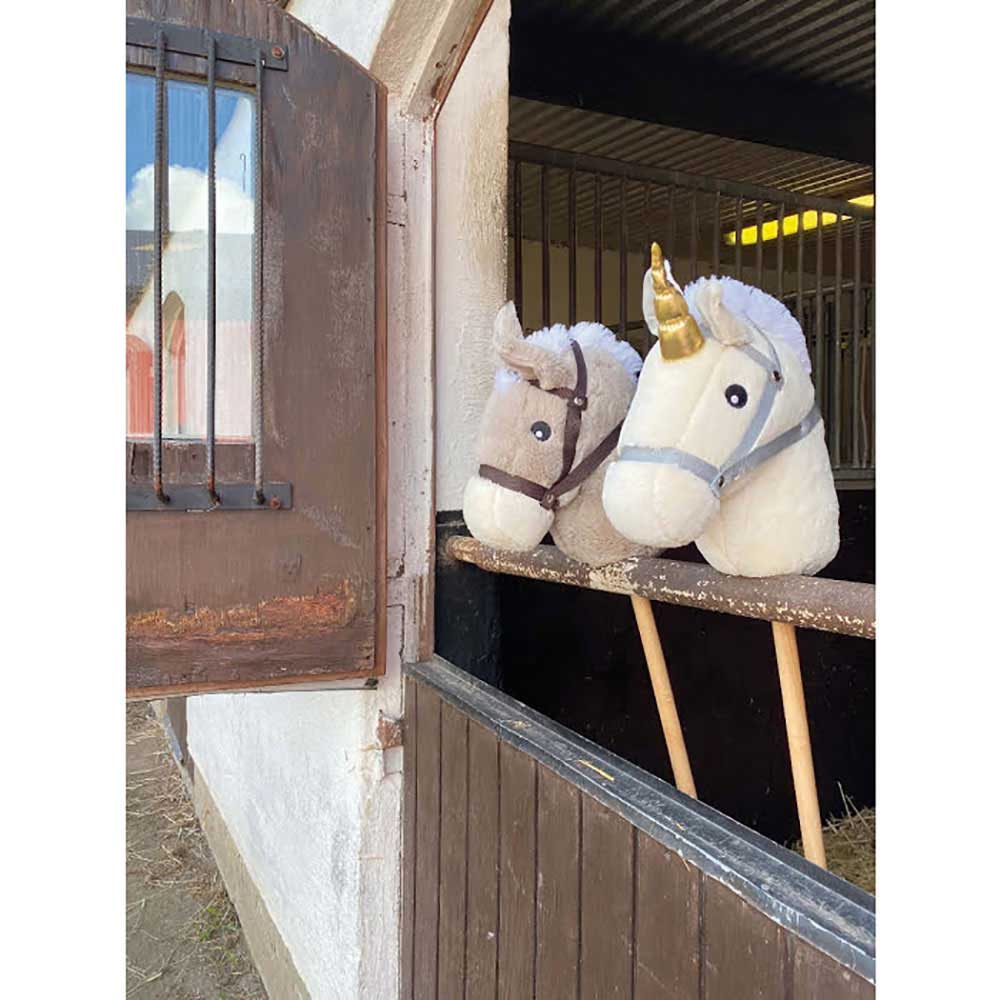 En fin och söt käpphäst i grå och vit färg med tillhörande träns. Rid ut i på äventyr med din nya följeslagare och bästa vän eller sätt upp en liten hinderbana som du löper igenom och se vem som hoppar högst.