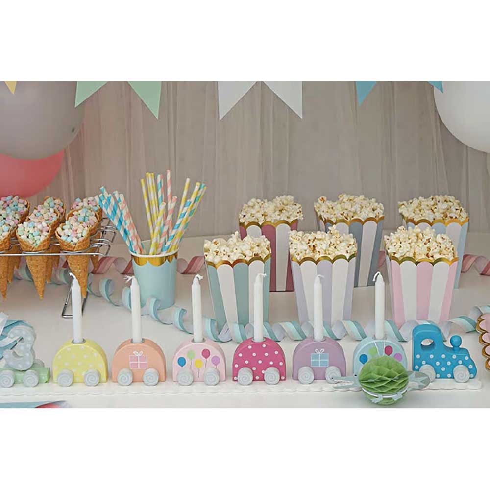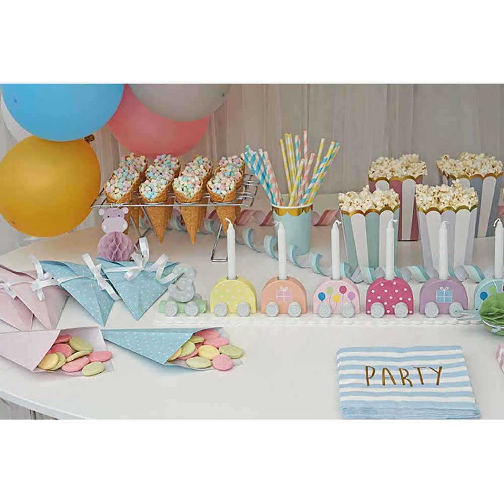 En födelsedagsljusstake i formen av ett tåg med plats för ljus. Tågvagnarna är prydda med fina födelsedagsmotiv och på sista vagnen sätter du en siffra mellan 0-9 beroende på vem som fyller år. Siffrorna ingår till tåget.