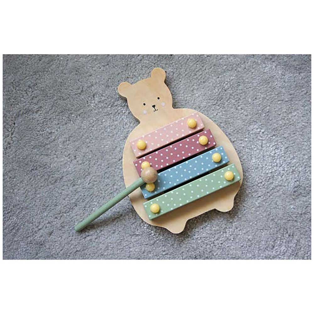 Xylofonen har 4 klangbrädor och en medföljande slagpinne. Gjord i trä och formad som en söt teddybjörn.