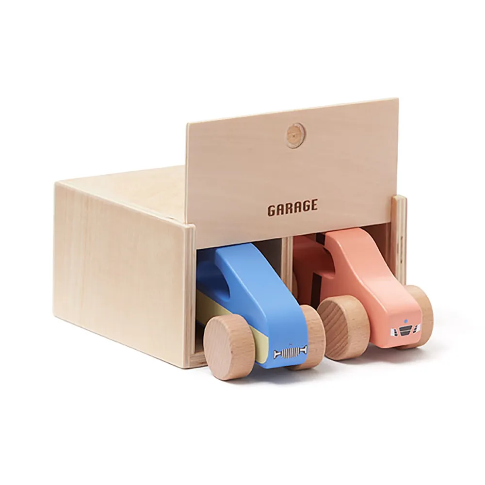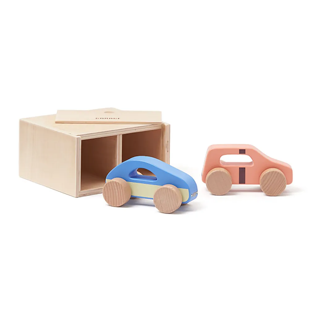 Greppvänliga och roliga bilar för de allra minsta! Setet inkluderar två bilar som levereras i en charmig träförpackning utformad som ett garage, med varsin parkeringsplats för bilarna. Bilarna har små hål på sidan, perfekt för att låtsas ladda eller tanka.
