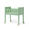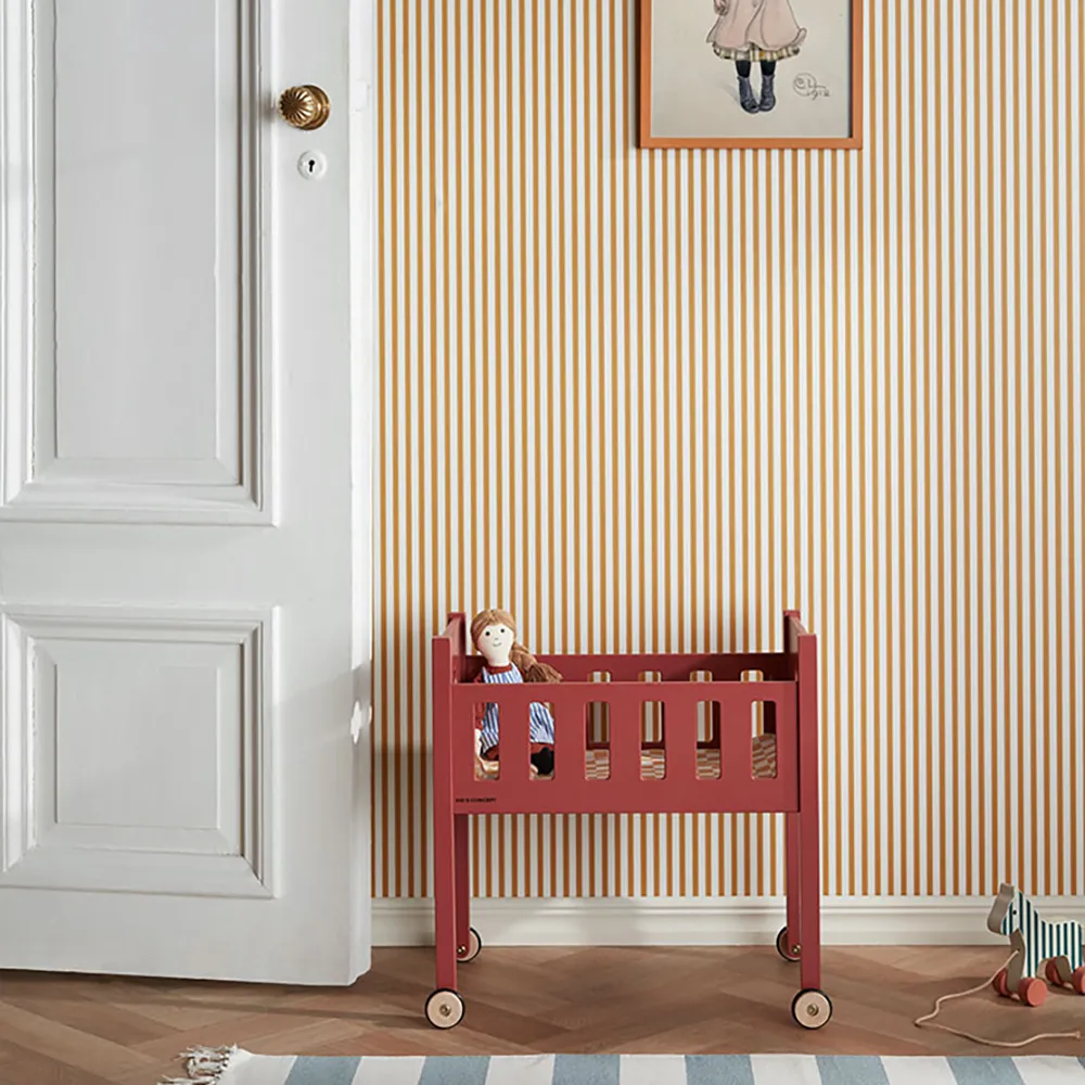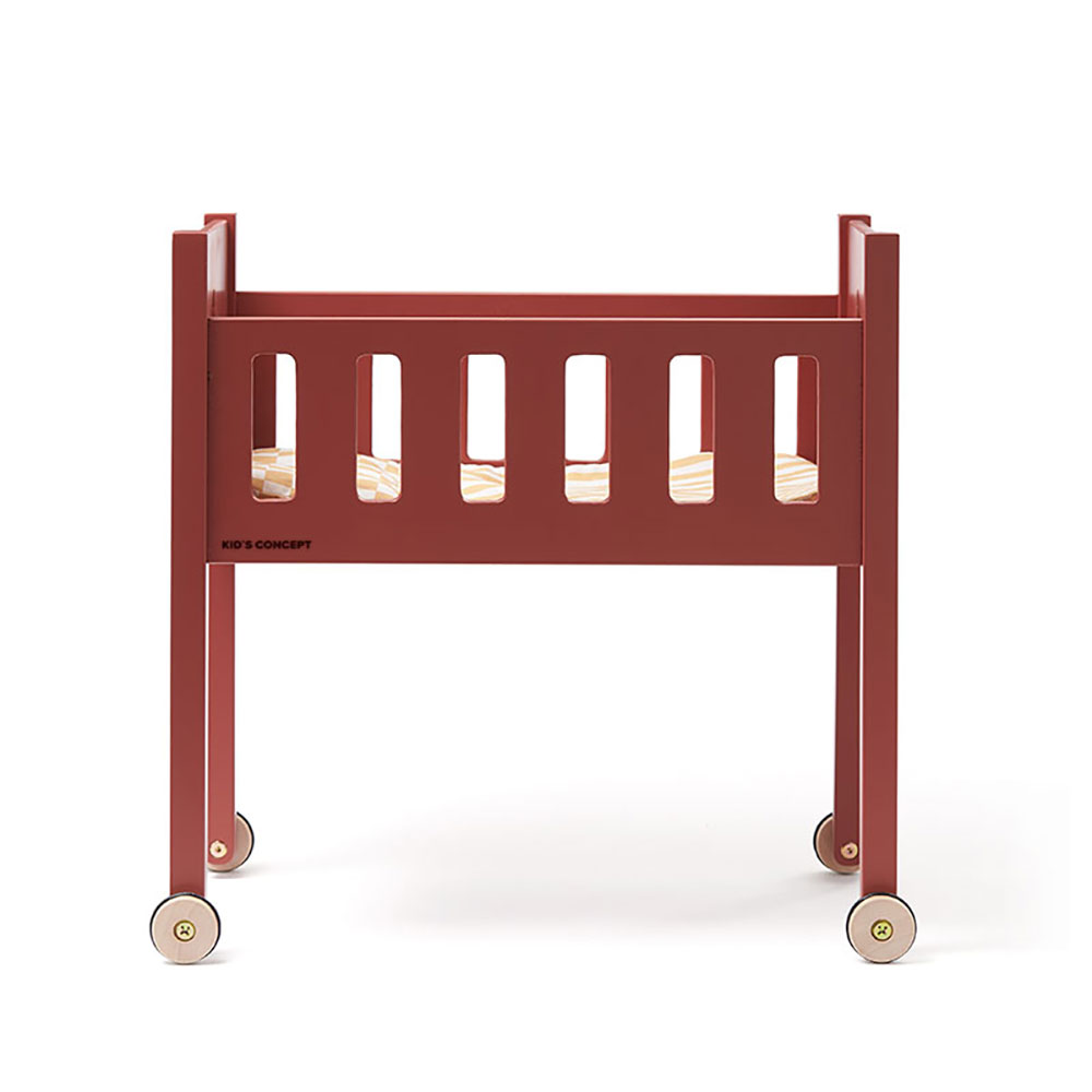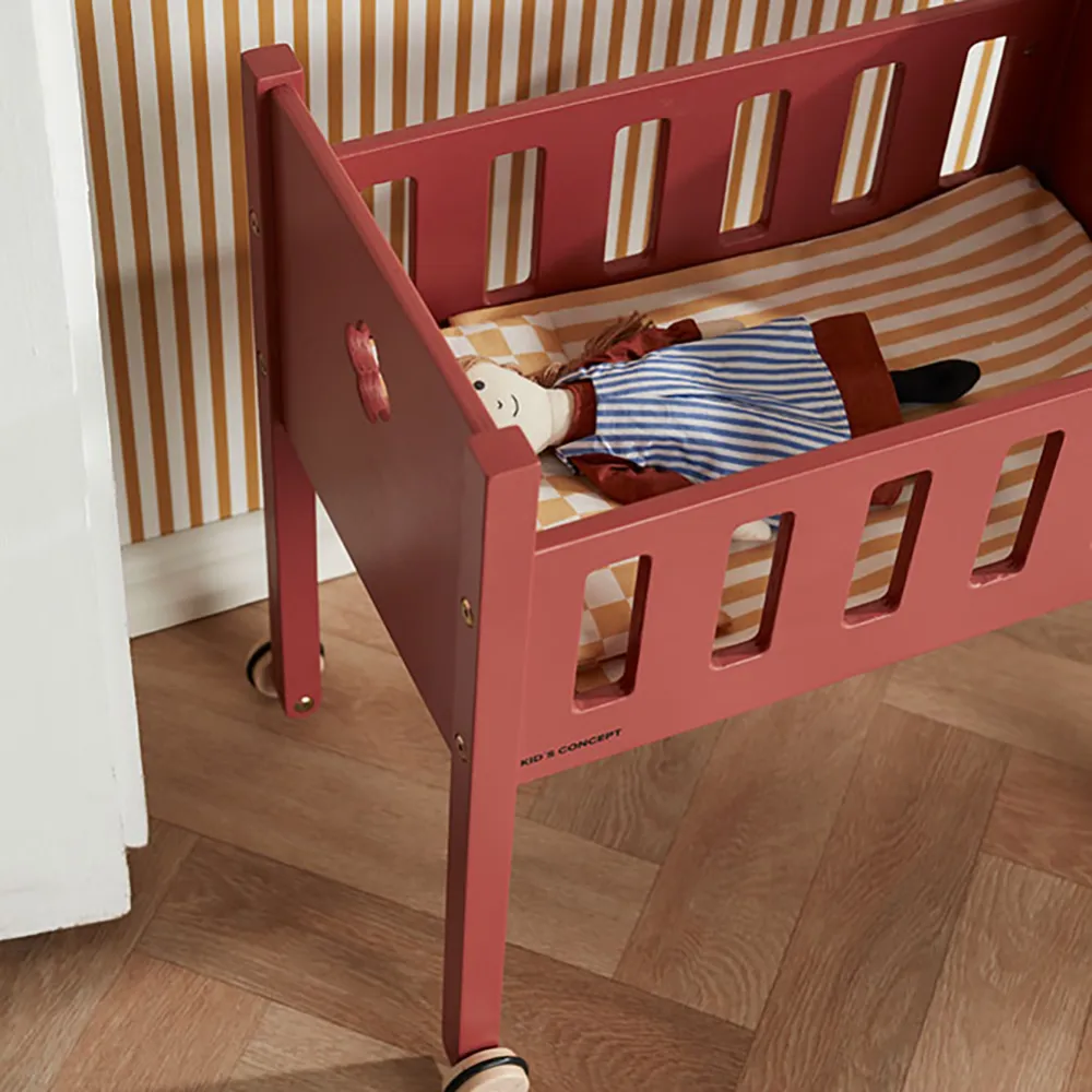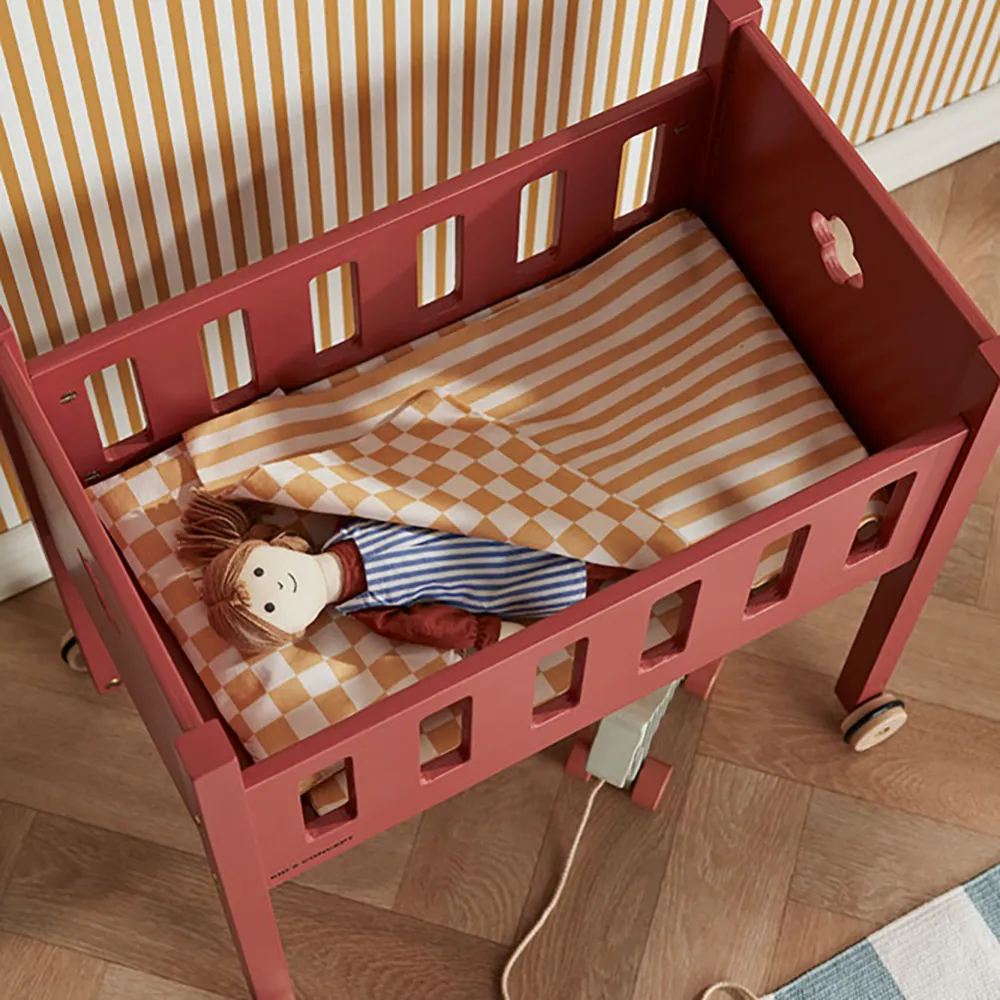 Docksäng från Kids Concept, tillverkad i trä och försedd med hjul, med vackert fyrklövermotiv utskuret i gavlarna. Sängen kommer med ett tvåsidigt bäddset där ena sidan har randigt mönster och andra sidan rutigt. Täcket och lakanet är ihopsydda, och en matchande kudde ingår. Färgerna och mönstren är inspirerade av Carl och Karin Larssons hem, där fyrklövern var en symbol för familj och lycka och en vanlig dekoration på väggar och möbler i deras hem, Lilla Hyttnäs.
