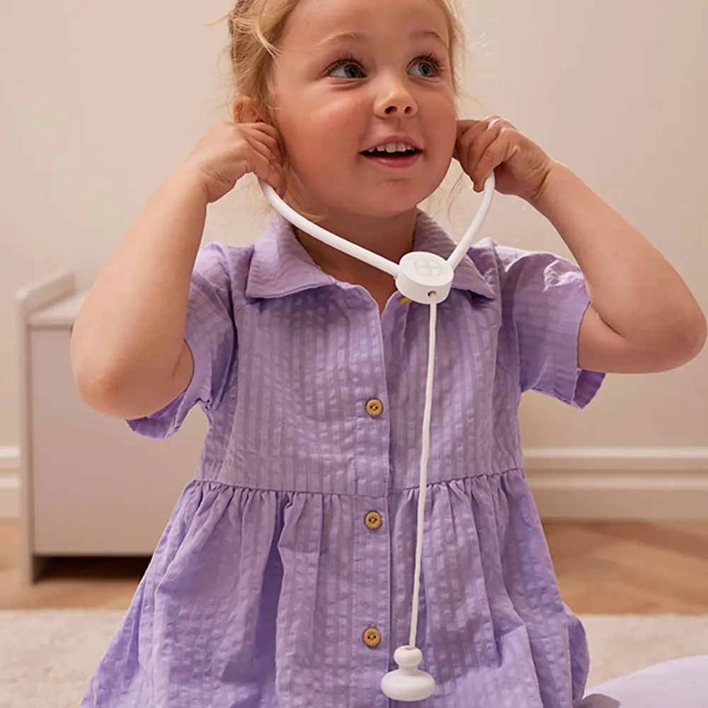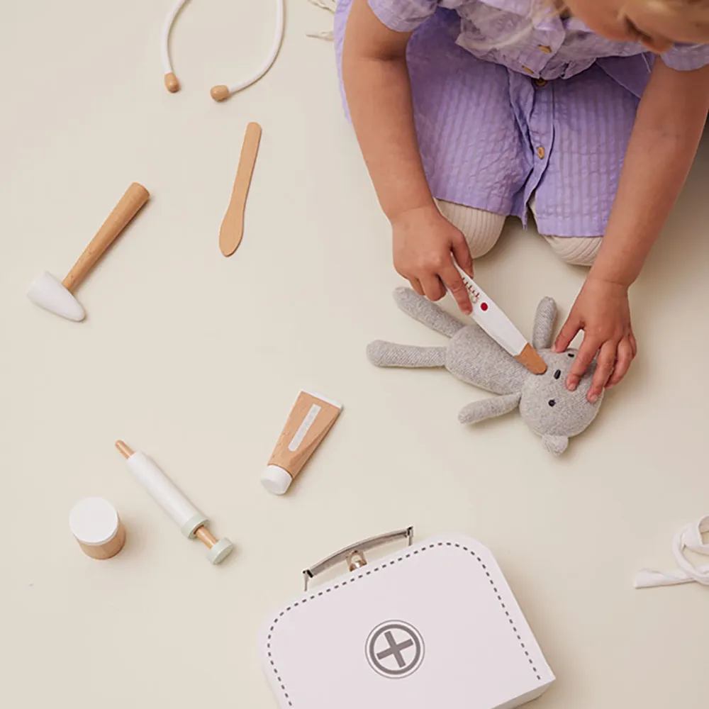 Doktorväska från Kids Concept – en fantastisk leksak för barn som älskar att leka doktor! Många barn får ju uppleva besök hos sjuksköterskor under sin uppväxt, och nu kan de få utlopp för sin fantasi. Doktorsväskan är fylld med allt en liten läkare eller sjuksköterska kan behöva. Inuti hittar du ett stetoskop, en termometer, tungspatel, pillerburk, salva, spruta och reflexhammare. Pillerburkens lock fästs med kardborre, vilket gör det enkelt att ta av och på, och sprutan är utdragbar för extra lekfullhet.