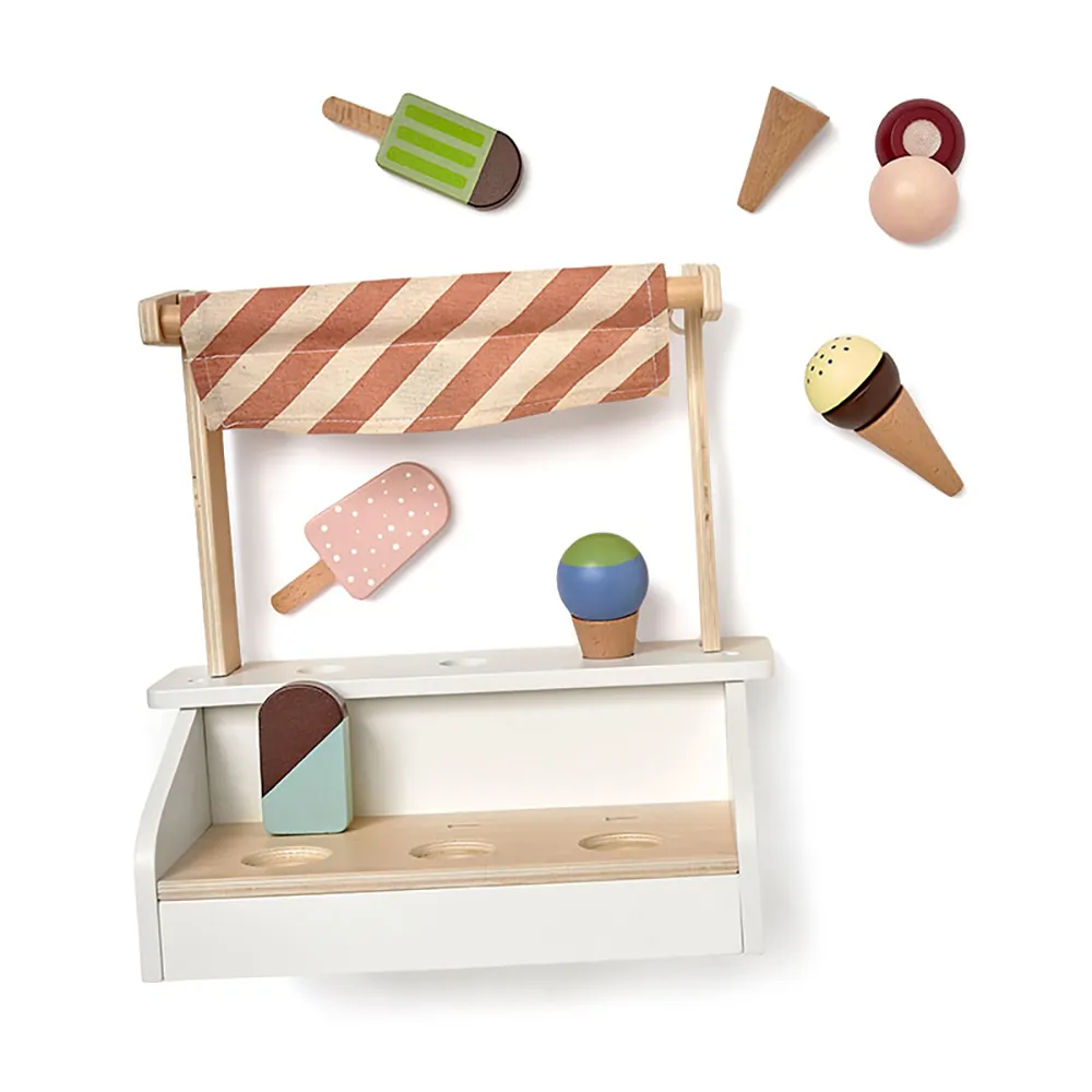 Kids Concept Glasstånd – perfekt för små glassälskare! Bjud in familj och vänner till en svalkande glassupplevelse. Setet innehåller 6 färgglada glassar, varav 2 går att ta isär och sätta ihop för extra lekmöjligheter. Den charmiga bomullsmarkisen skyddar glassarna från solens strålar och skapar en härlig känsla av riktig glasskiosk.