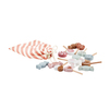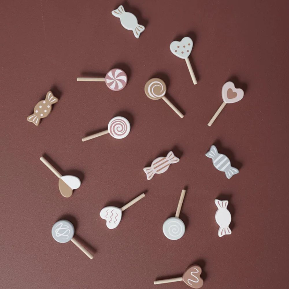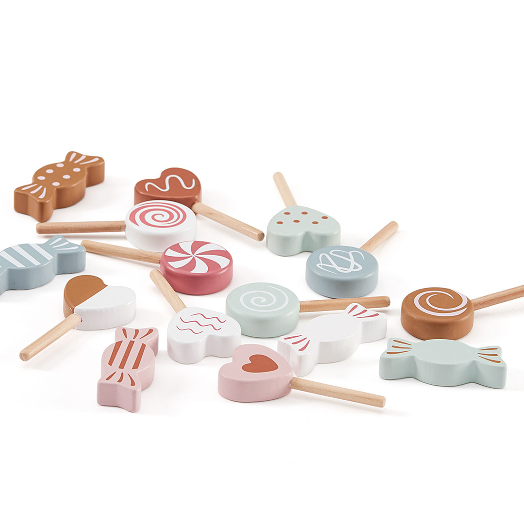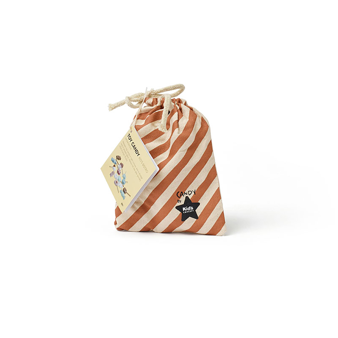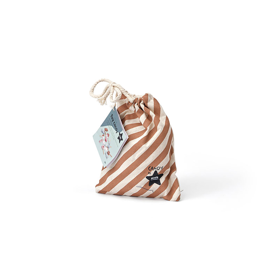 Fint leksaksgodis och klubbor i ljusa färger med förvaringspåse i bomullstyg.