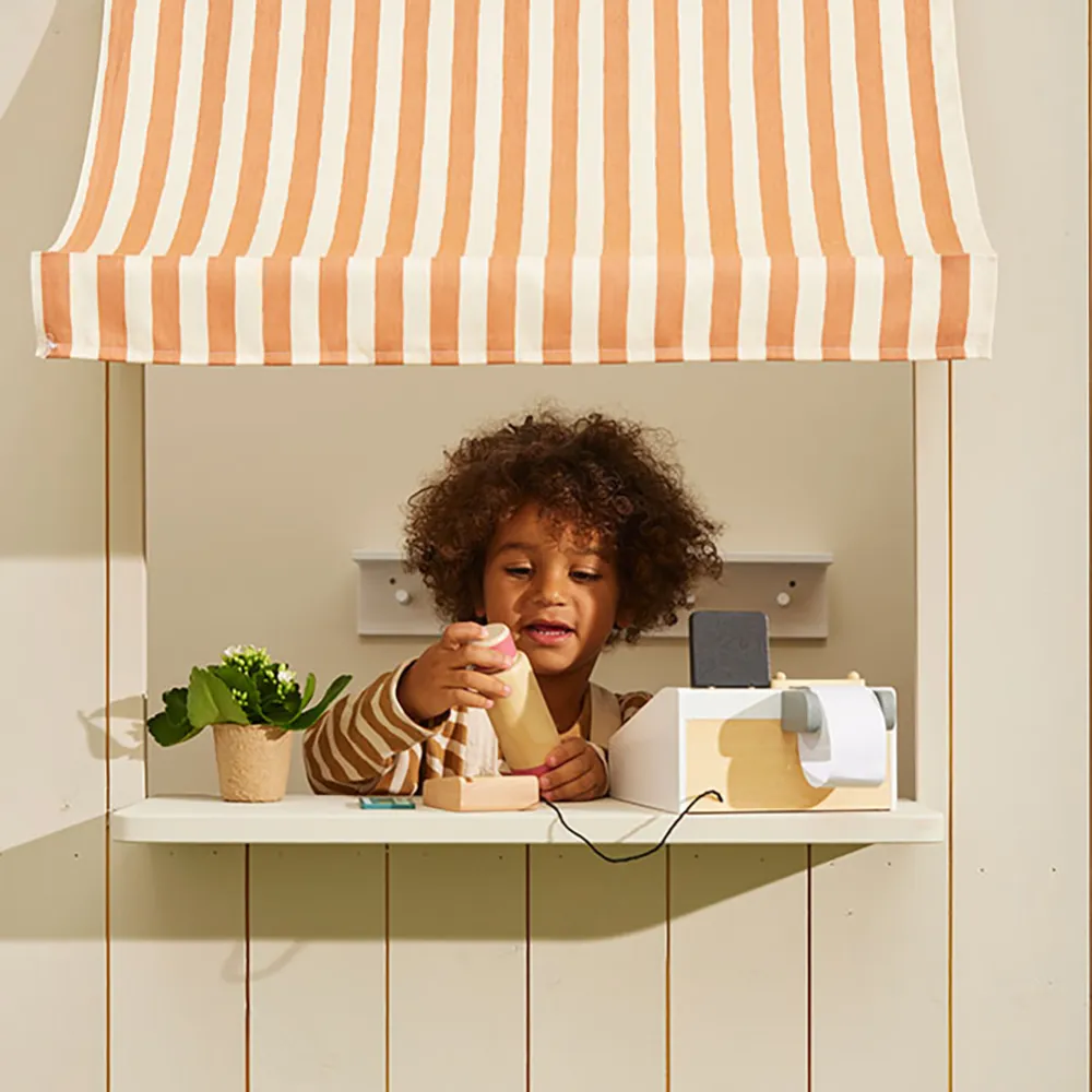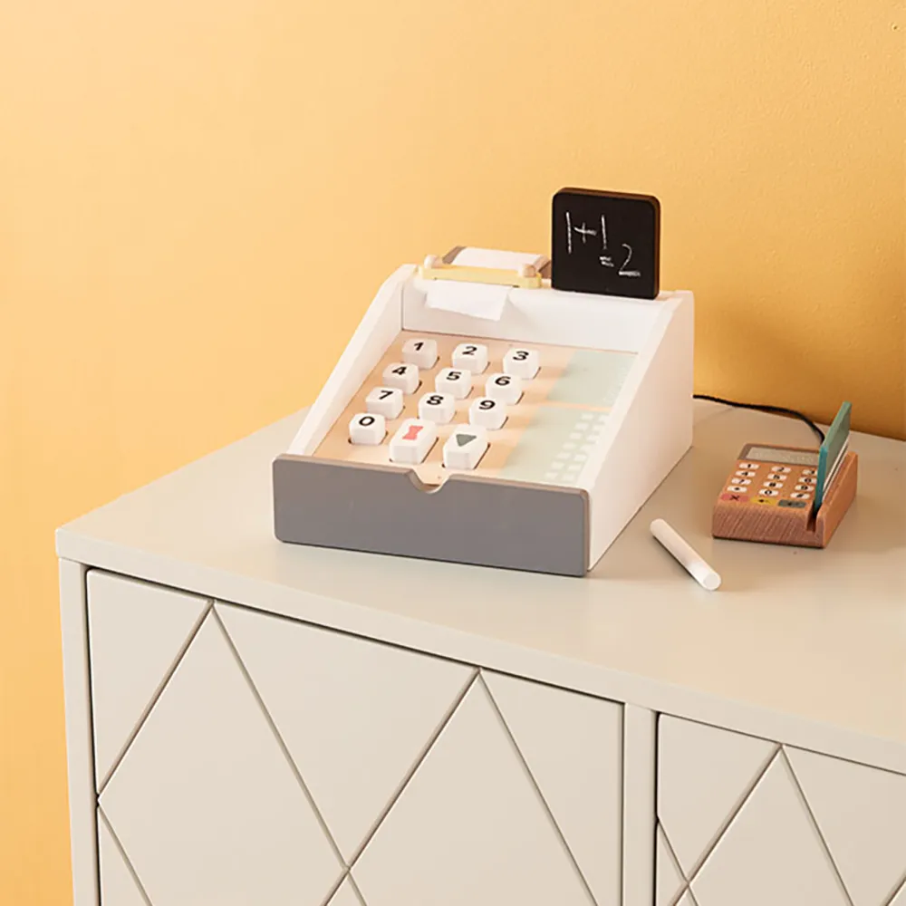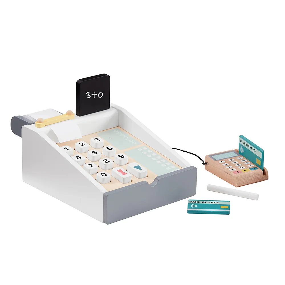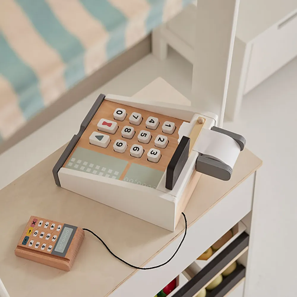 Kassapparat i trä i neutrala färger – den perfekta leksaken för kiosken eller affären! Barnen kan trycka på knapparna, dra de två kreditkorten genom korthållaren och öppna kassalådan. Det finns även en liten tavla där de kan skriva priser med den medföljande kritan. Kassapparaten har en standardstorlek på kvittorullen, vilket gör det enkelt att hitta nya rullar i vanliga kontorsbutiker.