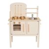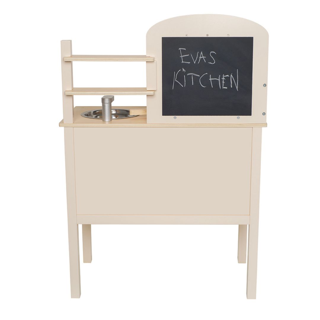 Ett fantastiskt leksakskök för alla små matälskare! I detta eleganta beige kök kan du snabbt bli en riktig mästerkock. Köket är fullt av roliga detaljer som diskho, spishäll, ugn, kastrull, stekpanna och tre köksredskap. Låt fantasin flöda och skapa underbara måltider till hela familjen. På baksidan av spisen finns en griffeltavla där du kan skriva dagens meny. Köket är utrustat med spis, ugn, diskho, förvaringsskåp och två hyllor med gott om plats för alla tillbehör. Luckorna kan öppnas, och spishällen har två plattor med vridbara knappar för att justera värmen. När maten är klar kan disken tvättas i vasken. Det finns krokar på väggen för köksredskap, och två fina kastruller ingår. Bon appétit!