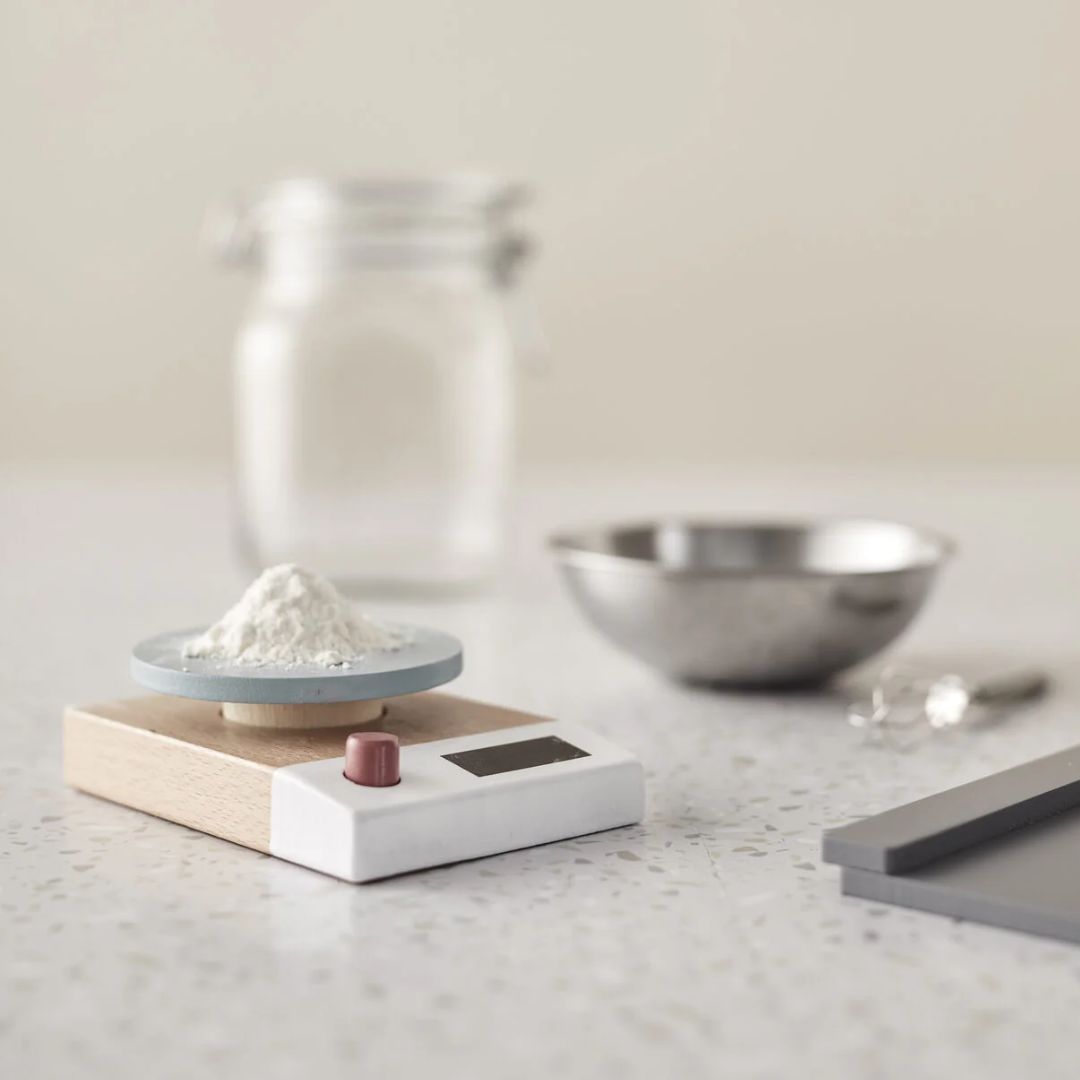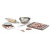 Innehåller pepparkaksdeg, figurer, kavel (endast avsedd att leka med). Bakplåt, vispskål och visp i stål samt en våg.