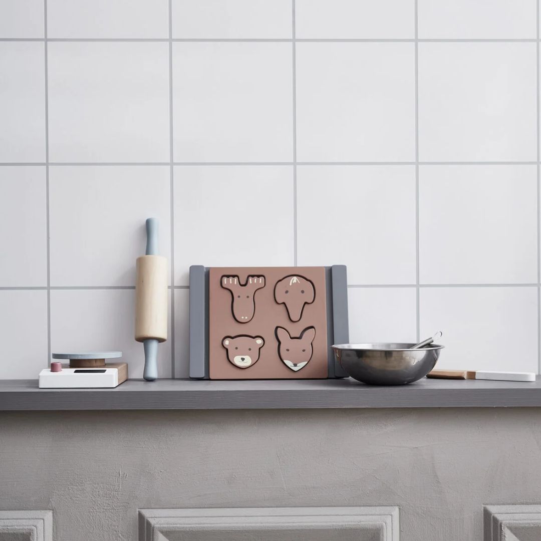 Fint bakset i trä med tillbehör. Låt små mästerkockar baka pepparkakor i form av söta djur.