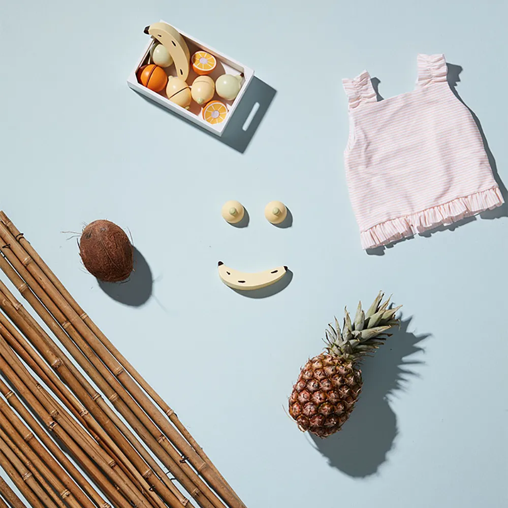 I lådan hittar du en färgglad samling av banan, kiwi, jordgubbar, äpple, päron och apelsiner. För ännu mer interaktiv lek kan apelsinen och kiwin delas och sättas ihop igen med kardborrefästen – ett roligt sätt att träna finmotorik och kreativitet!