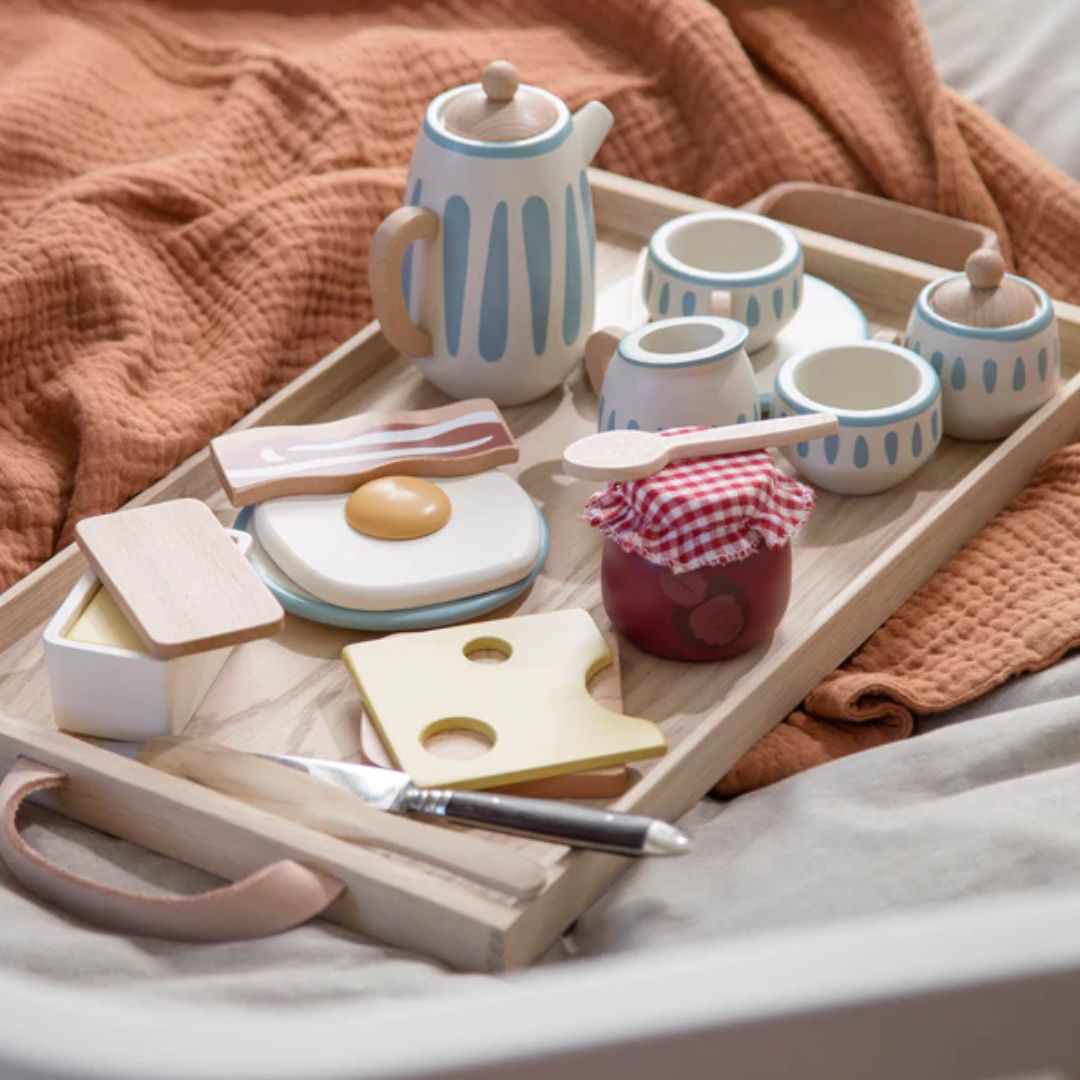 Sebra Food frukost är gjord av trä. Sebra Food träleksaker är avsedda för rollspel och som-om-lek, och kommer att inspirera barn att leka kockar, butiker, servitörer eller picknick. De fem produkterna - ett stekt ägg, en skiva bacon, en bit rostat bröd med ost, en vit smörskål med ett trälock och smör, samt hemgjord sylt i en burk med ett rutigt bomulllock. Frukostprodukterna är packade i en fransk-inspirerad virkad shoppingväska. Leksaker utan plast, utan oönskad kemi och med lång livslängd. Produkterna har tillverkats i bokträ och MDF. Rekommenderad ålder: 1+.