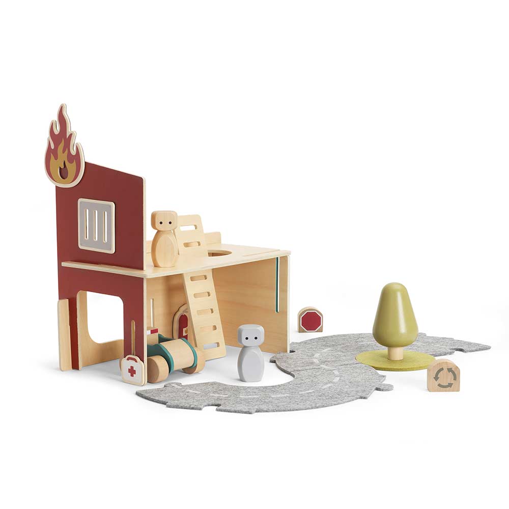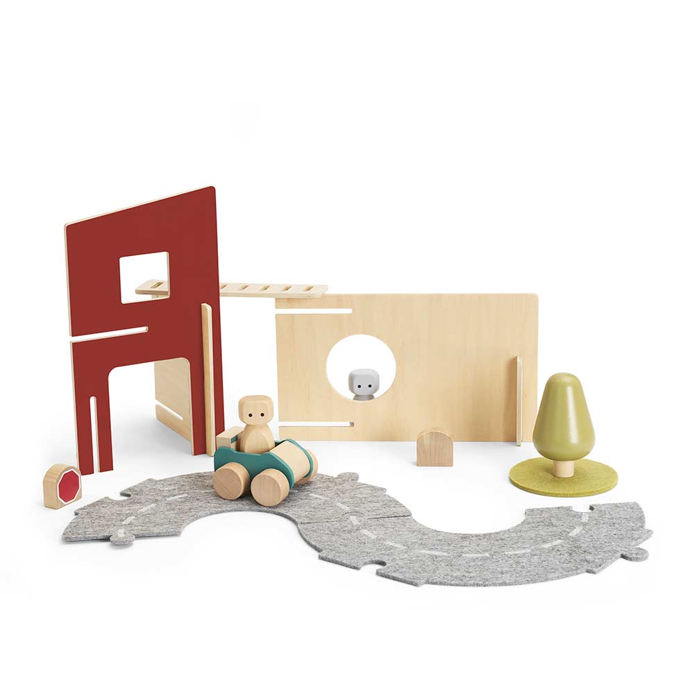 Kreativ och flexibel lekvärld. Med byggbara väggar, lekplatta, magnetiska frontväggar och magneter ges barnet de rätta verktygen att lätt komma igång med utvecklande lek oavsett ålder. De enkla formerna och de abstrakta figurerna skapar förutsättningar för att enkelt bygga upp sin egen fantasivärld - liten som stor. Kanske börjar leken runt räddningstjänsten som polis, brandman eller ambulanspersonal. Men efterhand kan fantasin få världen att växa och bli något helt annat.