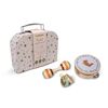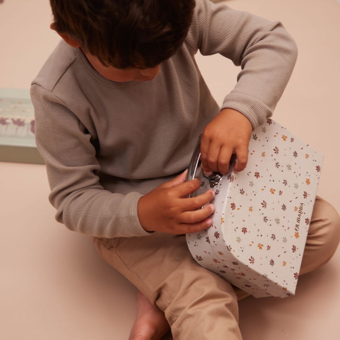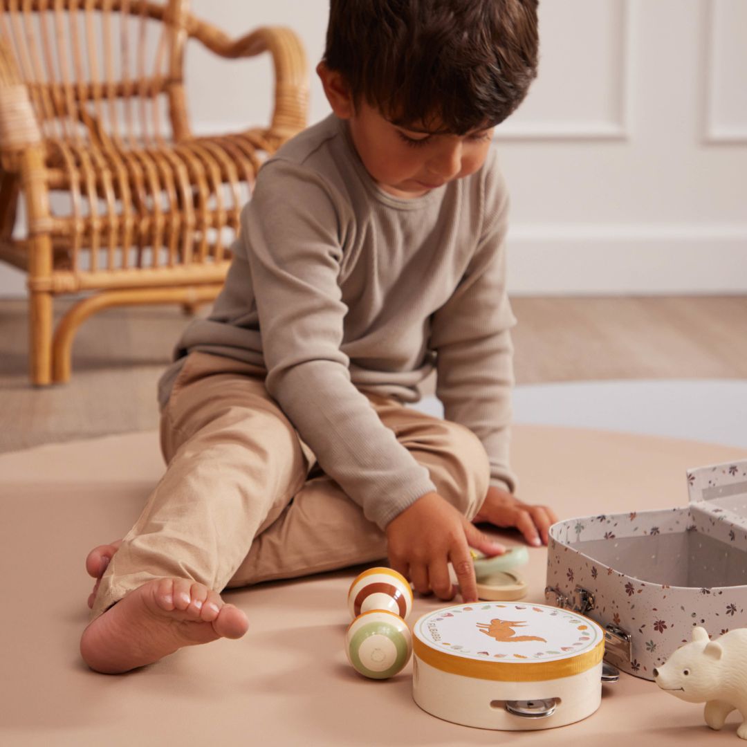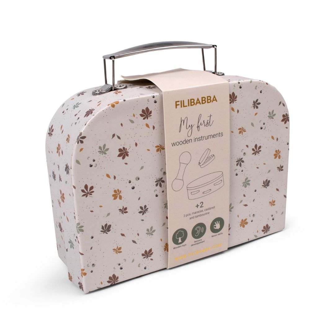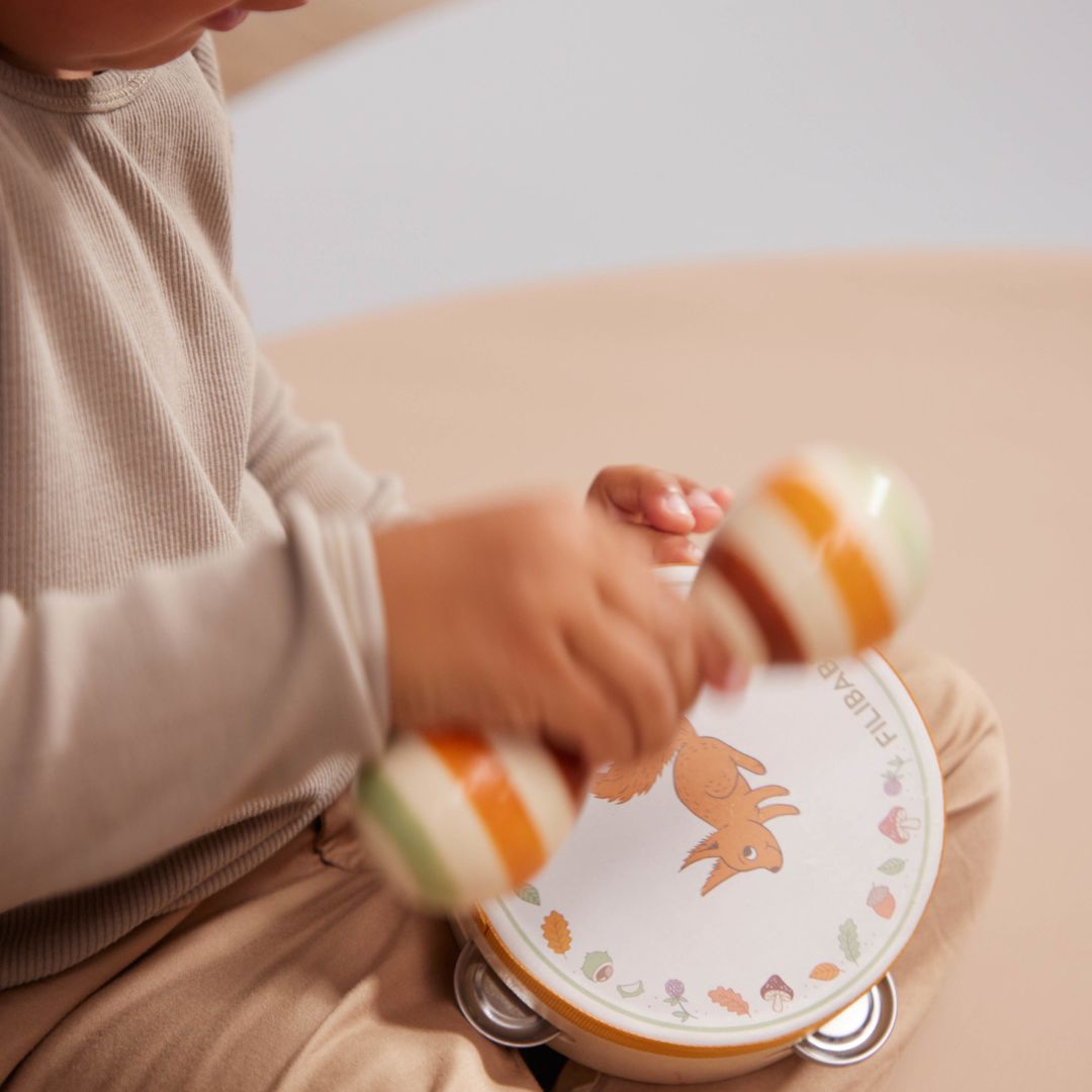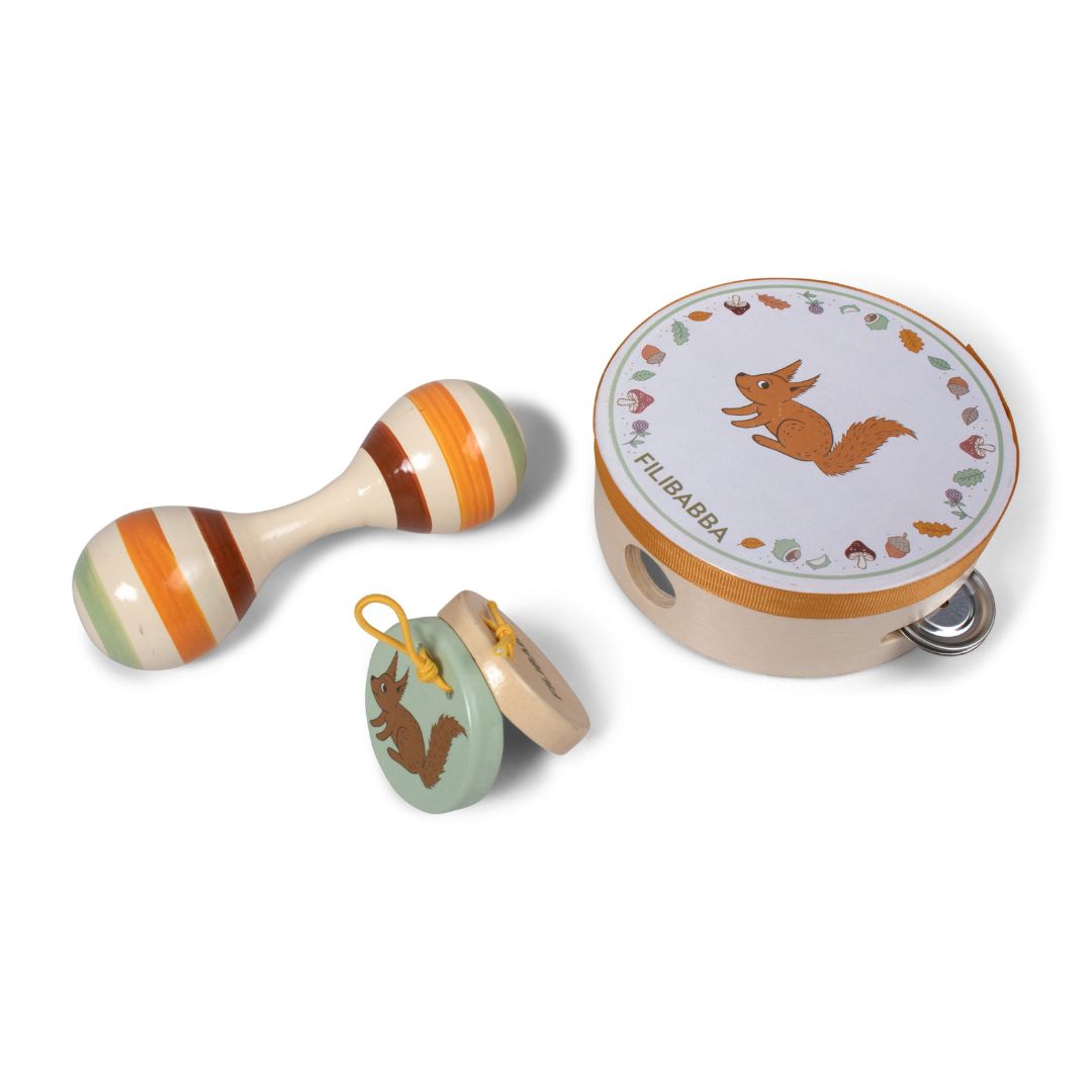 Nu kör vi! Med den här söta leksaksresväskan med instrument kan ditt barn utforska ljud och rytmer och samtidigt utveckla finmotoriken. Resväskan innehåller tre instrument: kastanjett, maracas och tamburin. Alla instrument är tillverkade av antingen poppel eller bokträ och är dekorerade med de sötaste illustrationerna av ekorrar och element från naturen. Själva resväskan är dekorerad med det söta trycket Kastanjer med färgglada löv. Med denna praktiska resväska kan setet enkelt tas med på resan och kan snabbt rensas snyggt ur vägen när konserten är över. Hela setet är noggrant testat och godkänt enligt den europeiska säkerhetsstandarden för leksaker.
