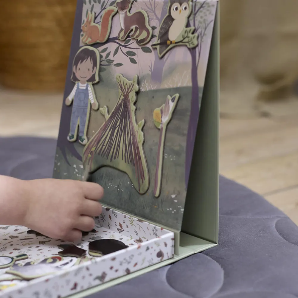 En liten äventyrare har byggt ett fort i skogen, och snart kommer många vänliga djur på besök. Detta fantastiska magnetspel med massor av djurfigurer inspirerar ditt barn att föreställa sig och återskapa sitt eget äventyr i den vilda skogen. Det praktiska magnetspelet har 20 färgglada, handritade figurer som ger skärmfri underhållning och uppmuntrar till kreativ lek. Lämpligt från tre år och uppåt, perfekt för hela familjen. Mina specialfunktioner: - Perfekt resespel. - Ny och förbättrad förpackning med bekvämt bärhandtag. - Lämplig från 3 år och uppåt. Ålder från (månader): 36-96 Tvättråd: Rengör med en fuktig trasa och lite tvål vid behov. Material: Grå kartong, bestruket papper, magnetiska ark. Färg: Grön, Flerfärgad