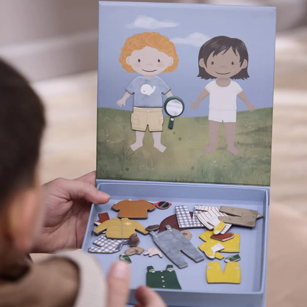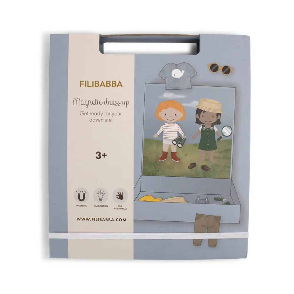 En riktig klassiker i nya kläder! I detta fantastiska magnetspel hjälper du de två barnen att göra sig redo för sitt äventyr. Regn eller solsken, tack vare massor av vackra kläder och accessoarer är de välutrustade för alla expeditioner. Det här praktiska magnetspelet innehåller färgglada, handritade dockor och massor av tillbehör, vilket ger skärmfri underhållning och inspirerar till kreativ lek. Lämpligt från tre år och uppåt, perfekt för hela familjen. Mina specialfunktioner: - Perfekt resespel. - Ny och förbättrad förpackning med ett bekvämt bärhandtag. - Lämplig från 3 år och uppåt. Ålder från (månader): 36-96 Tvättråd: Rengör med en fuktig trasa och lite tvål vid behov. Material: Grå kartong, bestruket papper, magnetiska ark. Färg: Blå, Flerfärgad