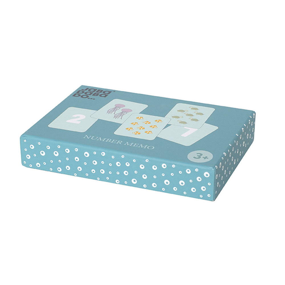 Matcha motiv och siffror på lekfullt sätt! Jabadabados siffermemo med havstema är både enkelt och roligt att spela med familj och vänner. De 20 rektangulära korten är prydda med olika ljuvliga motiv inspirerade av havet. Målet är att matcha ihop alla de 10 paren. Lägg korten med motiven ner mot bordet och vänd sedan upp två kort i taget. Fick du ett par där antalet djur på en kortet matchar siffran på andra kortet? Grattis, då får du vända upp två kort till. Men blev det ingen matchning denna gång? Då går turen över till din motståndare. Spelaren med flest matchande par vinner. Memo kan spelas både enskilt och i par och tränar bland annat barnens fokus, koncentration och förmågan att vänta på sin tur. Nummermemo är också ett bra och roligt sätt för barn att lära sig siffror och enklare räkning. Må bästa spelare vinna! Kortens storlek är 9x12 cm.