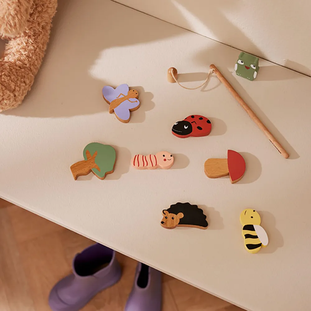Upplev spänningen av en fisketur med vårt charmiga fiskespel i FSC-certifierat trä! Det här spelet erbjuder timmar av underhållning och lärande för barn i alla åldrar. Med ett stiligt träfiskespö och åtta färgglada fiskar, var och en med en magnet gömd inuti, blir det enkelt och roligt att fiska. Använd magneten i fiskespöet som agn och ge dig ut på en äventyrfylld fisketur – byt spö med varandra för att göra leken ännu mer spännande!