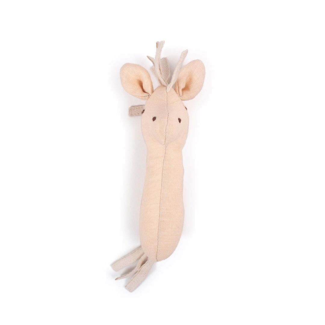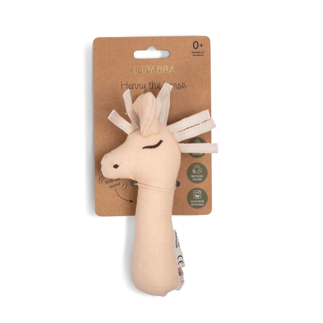 Denna söta lilla skallra med ett gulligt hästhuvud är tillverkad av mjukt linnetyg. Henry the Horses mjuka ansiktsuttryck kommer snabbt att fånga ditt barns intresse och har massor av fina detaljer som de små händerna bara måste utforska. Alla små detaljer är naturligtvis broderade på leksaken, så du behöver inte oroa dig för smådelar. Skallran är godkänd från 0+. Inuti huvudet har Henry en bjällra med ett mjukt ringande ljud som ditt barn definitivt kommer att älska. Den lilla storleken gör det lätt för ditt barn att greppa och hålla i skallran. För att ta hand om miljön är skallran fylld med återvunnen polyester. Hästen Henry älskar att ta ett dopp och kan enkelt rengöras i tvättmaskinen med ett fintvättprogram. Henry är handgjord vilket ger din söta vän en unik look.