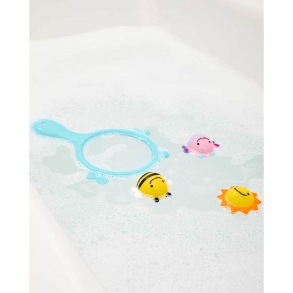 Ditt barn har nu möjligheten att träna på att kasta, spruta, skopa och fånga saker i vattnet. Håven är designad med ett handtag som är lätt för små händer att greppa. Badstunden får nya lekkamrater i form av en fjäril, ett bi och en sol. Dock bör du vara på din vakt, då dessa lekfulla figurer har förmågan att spruta vatten.