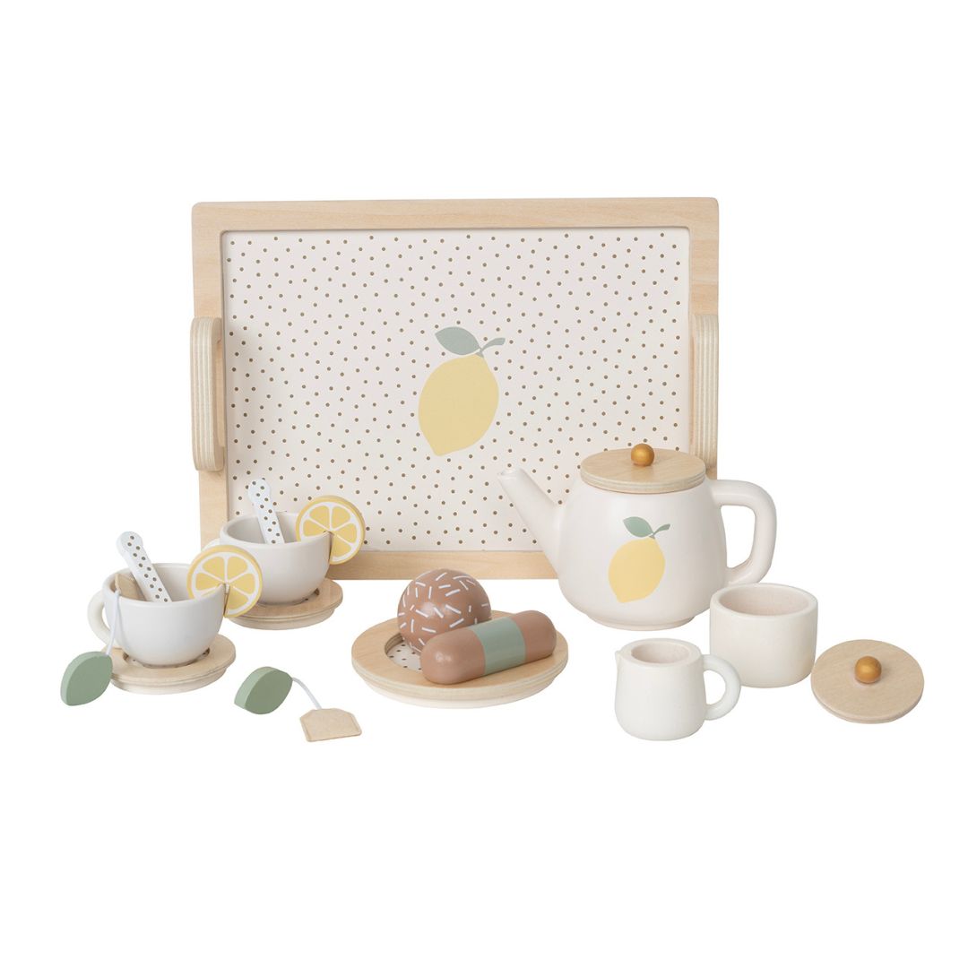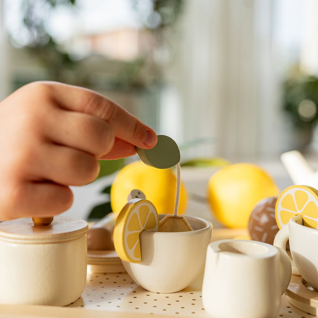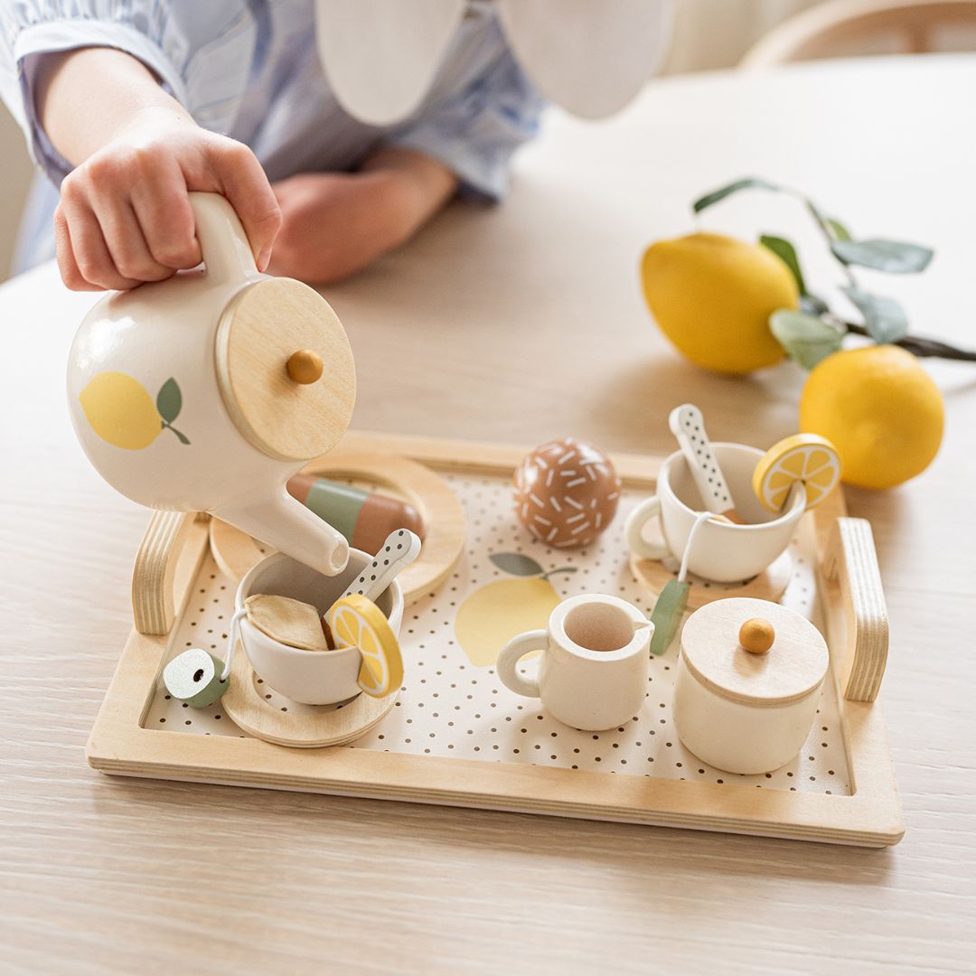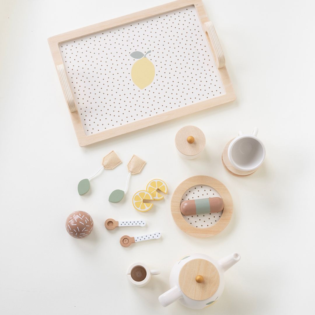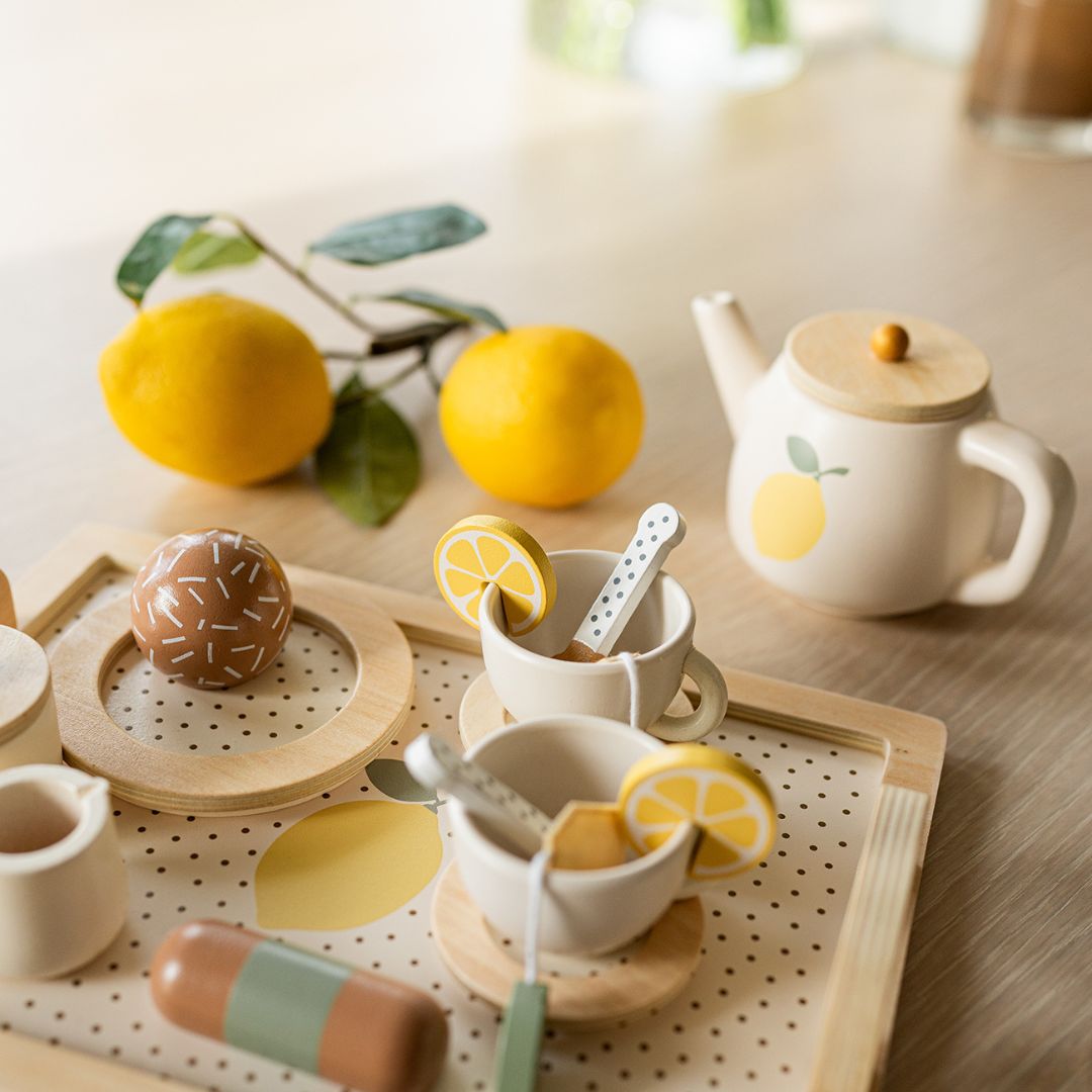 Te-stunden är väll ändå höstens mysigaste stund. Med Jabadabados populära afternoon tea-set kan barnet bjuda hem alla sina vänner och familj på te och kakor. Precis som på en riktig lyxig afternoon tea kan barnet här duka upp med en fin servis utsmyckad med härliga citroner på och bjuda på goda kakor och bakverk till teet.