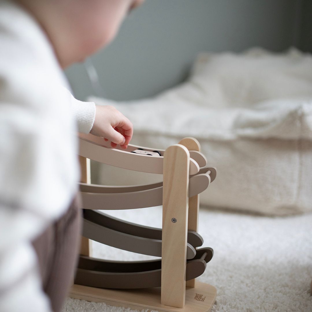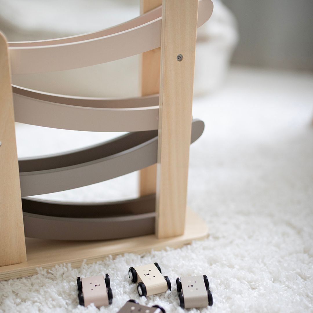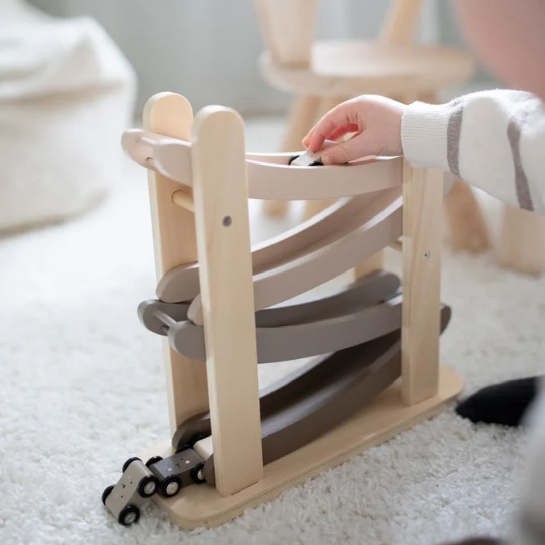 En kreativ och rolig bilbana i naturhärliga färger för alla biltokiga barn. Släpp bilarna längst upp från banan och se hur de snabbt åker hela vägen ner. En stimulerande och underhållande bilbana som håller ditt barn aktivt under lång tid. Tävla med dina vänner och se vilken bil som kommer ner snabbast. Ett måste till alla små racerförare.