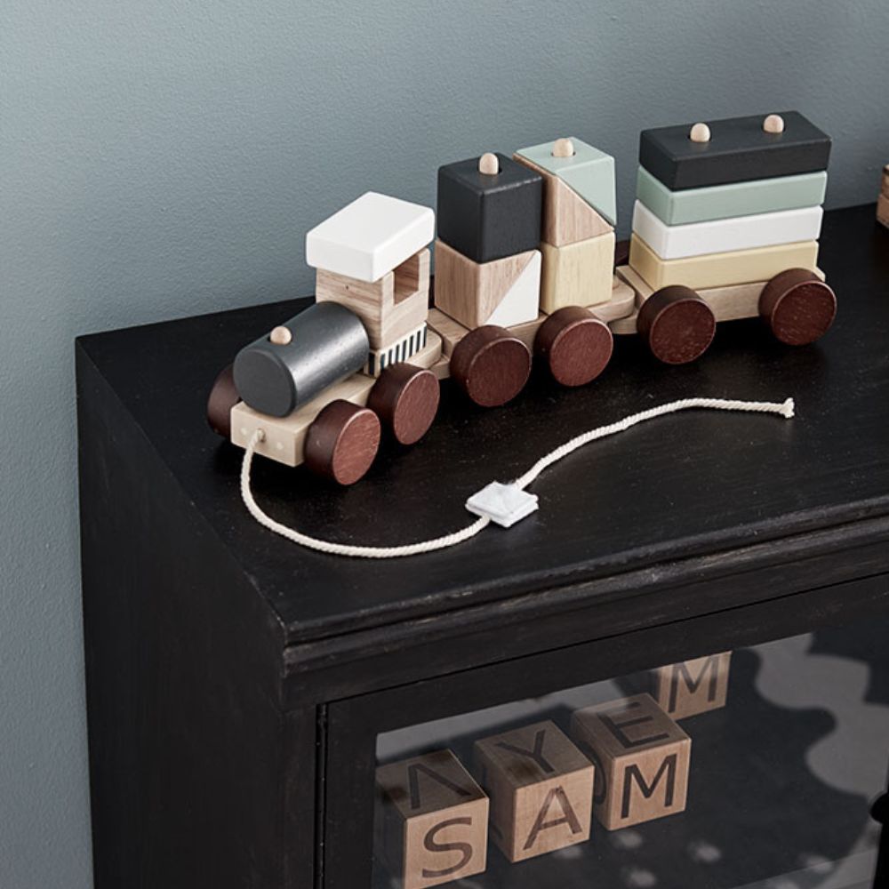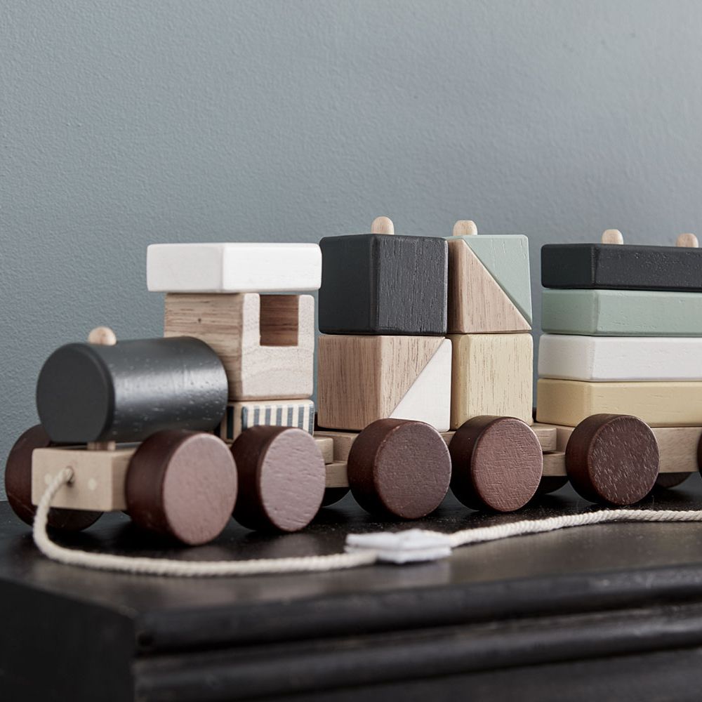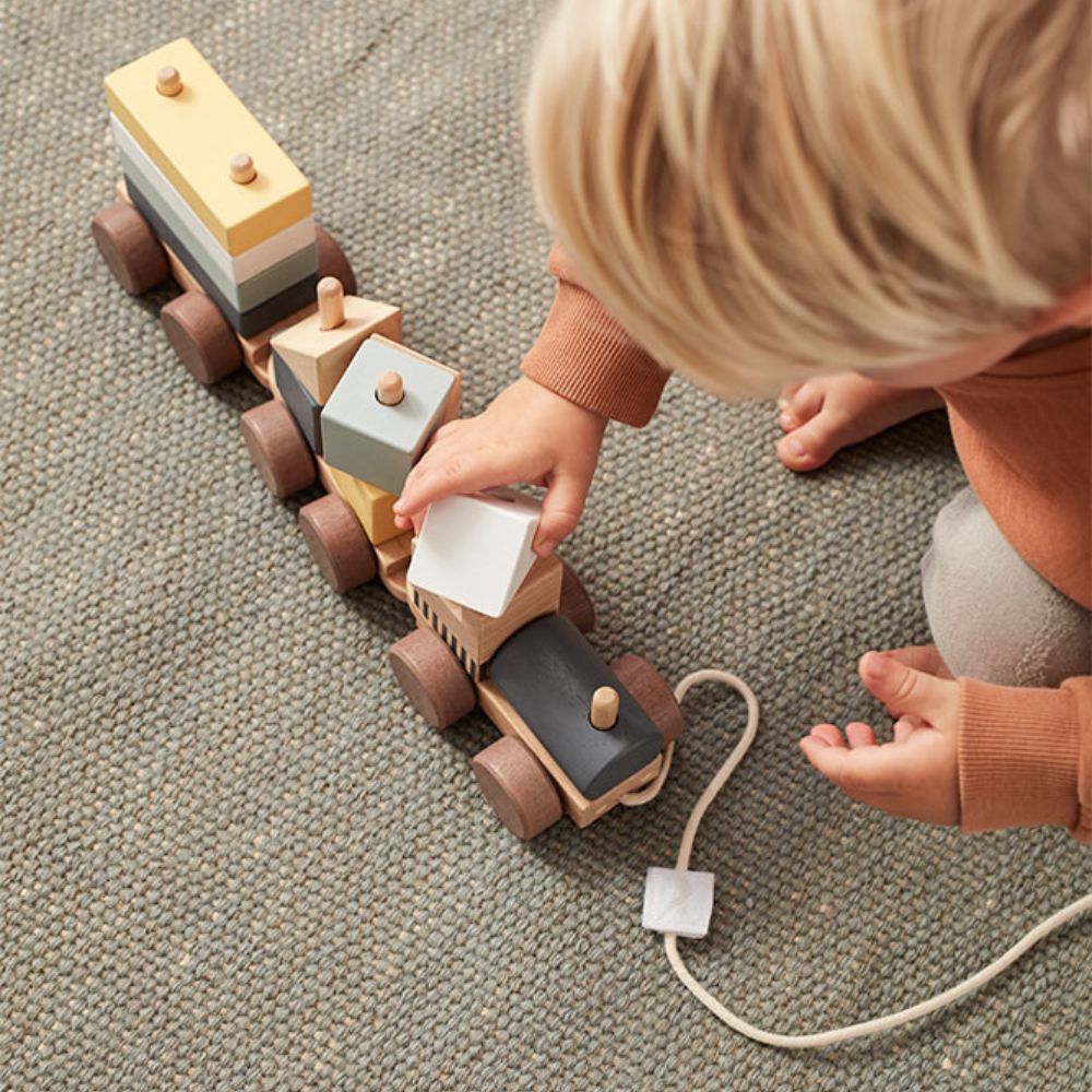 Dragleksak i form av ett tåg i naturfärgat trä med målade delar.