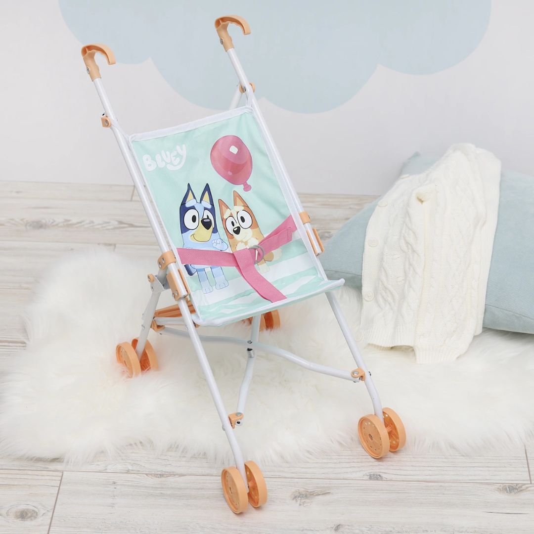 Blueys sulky är den perfekta dockvagnen för små äventyr på resande fot! Den är hopfällbar och har avtagbar klädsel, vilket gör den smidig att ta med överallt. Med det lilla säkerhetsbältet kan dockan spännas fast säkert, så att ni kan gå på promenader tillsammans utomhus. Sulkyen är designad för dockor upp till 45 cm och är ett roligt tillbehör för alla Bluey-fans där ute! Bluey är en oemotståndlig Blue Heeler-valp som älskar att leka och förvandlar vardagen till spännande äventyr. Med sin hjärta, humor och igenkännbara familjeliv har Bluey charmat barn i alla åldrar och blivit en älskad karaktär världen över.