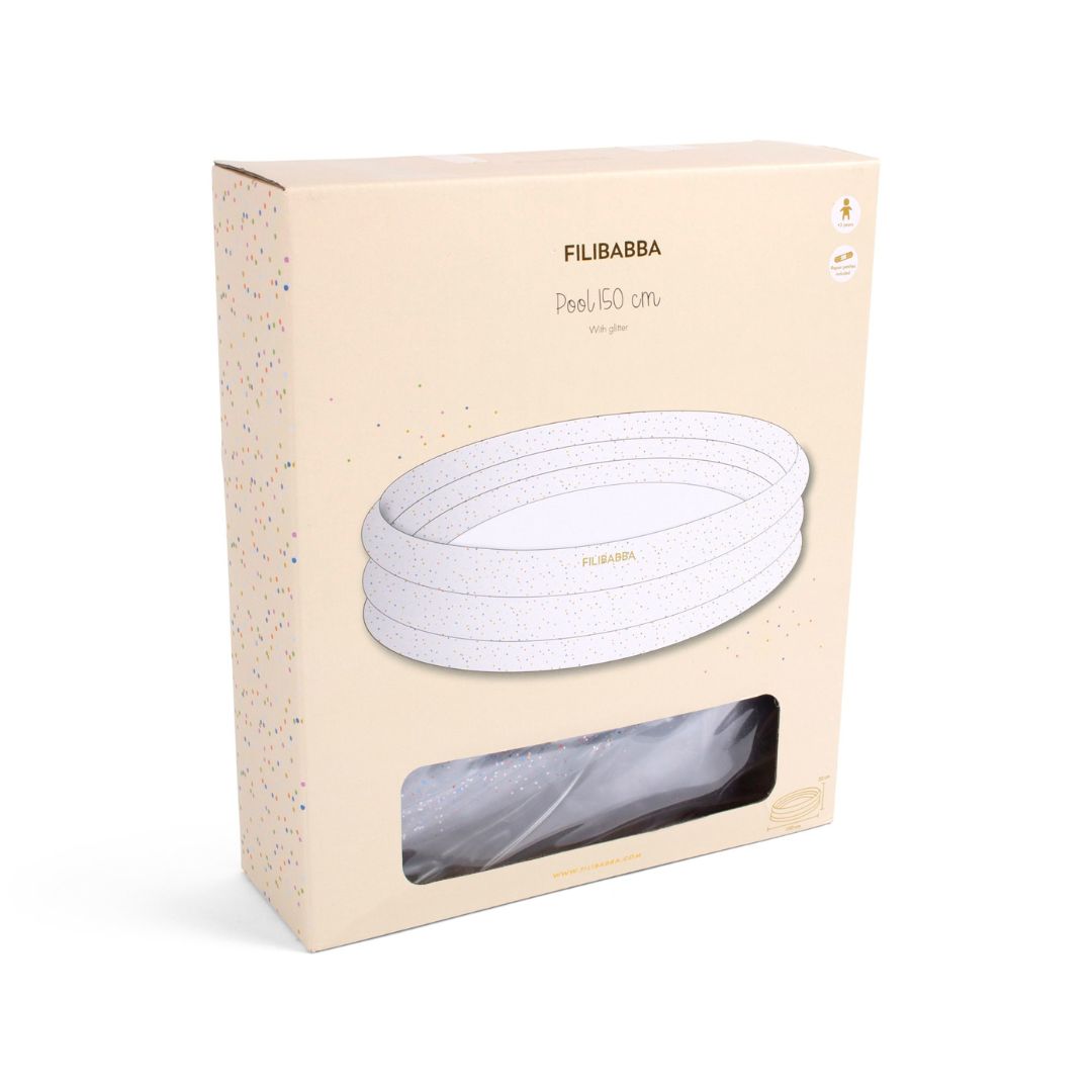 Skapa din egen regnbåge - om du behöver lite glitter för att få sommarkänslan att infinna sig är vår regnbågsglittriga pool perfekt för dig. Vår glitterserie gläder inte bara de små, utan erbjuder även oemotståndliga saker för äldre syskon. Våra simbassänger är tillverkade av särskilt högkvalitativ PVC med en tjocklek på 0,25 mm och levereras med tre transparenta reparationslappar så att du kan njuta av din pool under en längre tid. Låt vattenglädjen börja med vår superglittriga pool! Kapacitet: 230 l vid 70% fyllning. Låt aldrig ditt barn vara utan uppsikt när det leker i eller i närheten av poolen. Töm alltid poolen efter användning. Alla våra pooler är noggrant testade och godkända enligt den europeiska standarden EN-71 och de är CE-märkta. Ålder från (månader): 36-144 Tvättråd: Tvätta i varmt tvålvatten Lufttorka Material: PVC Färg: Guld, Transparent
