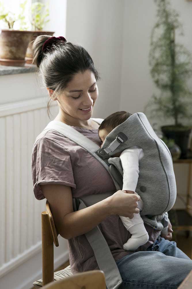 Mini ger ett bra stöd från de mjuka tygerna och formar sig kring bebisens rutt, ben och höft. Genom tyget känner du ditt barnets position och ryggens naturliga kurva. På Mini har du även ett justerbart och stadigt huvudstöd.