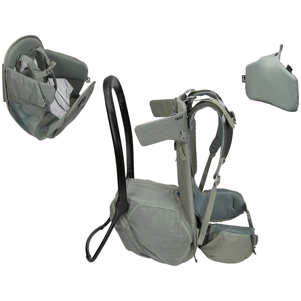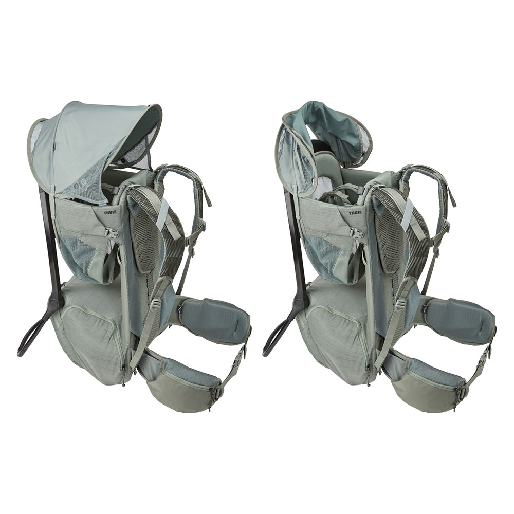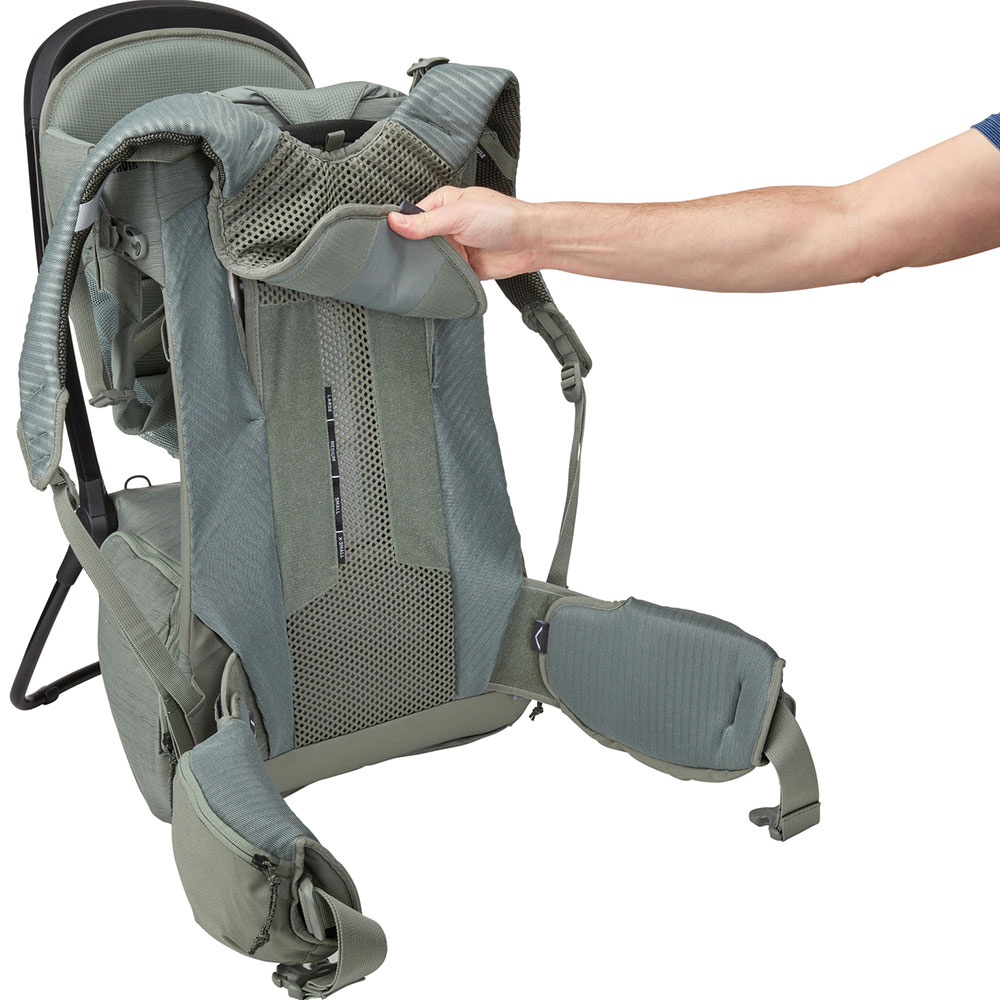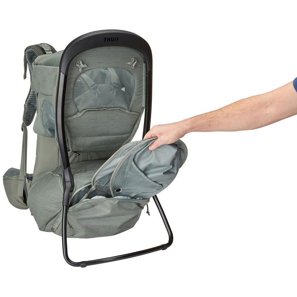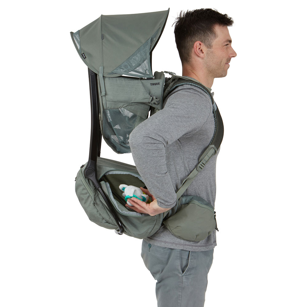 Den lätta Thule Sapling är också mycket bekväm för föräldrar att bära under längre vandringar. Det fullt justerbara rygg- och höftbältet ger en perfekt passform och möjliggör snabb överlämning mellan föräldrar. Dessutom gör öppningen i sidopanelen det enkelt att lyfta i och ur barnet, även om barnet rör sig mycket. Det praktiska 22-litersfacket är lätt att komma åt tack vare sidodragkedjorna, även medan ryggsäcken bärs.