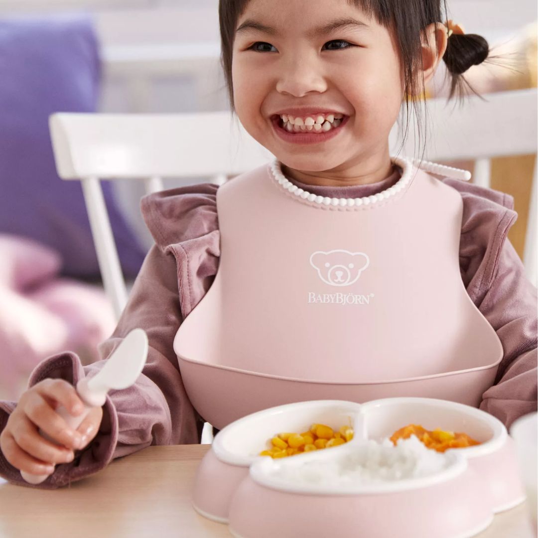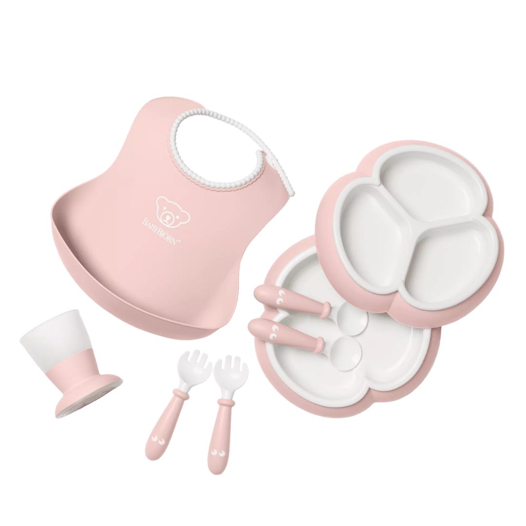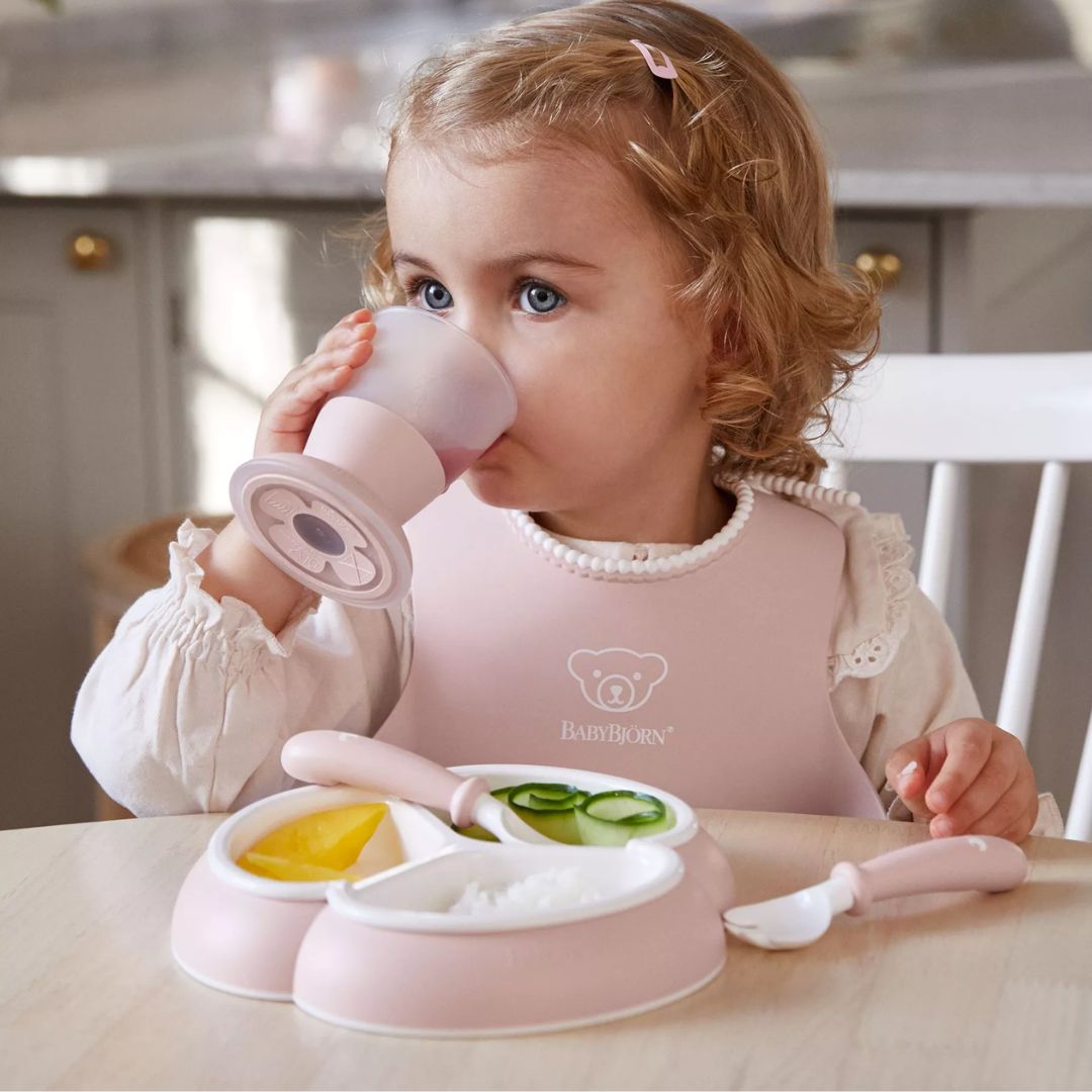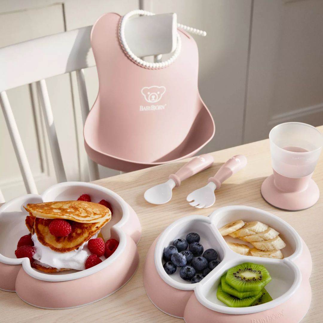 BabyBjörns 8-delade barnservis är särskilt utformad för små barn. Setet innehåller tallrikar, bestick, glas och en haklapp i fina färger. Haklappen har en djup ficka som fångar upp mat och smulor och är utrustad med en mjuk justerbar halsrem. Tallrikens unika träklöverform underlättar hantering av maten och den skidliknande listen på undersidan håller tallriken på plats. Besticken har korta handtag som är lätta att greppa och en design som förhindrar att de glider ner i tallriken. Glaset står stadigt och den frostade plasten gör det möjligt att se innehållet. Det här kittet är perfekt för barn som börjar äta själva och är lämplig från cirka 4 månaders ålder.
