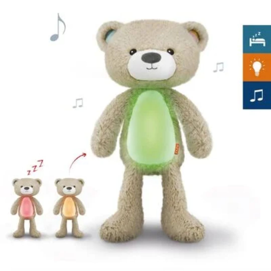 Fler funktioner inkluderar en gråtsensor som temporärt aktiverar Brodys mage för att trösta barnet, möjligheten att spela lugnande vaggvisor, vitt brus eller naturljud, samt automatisk avstängning efter 20 minuter av både ljud och ljus. Brody fungerar som en sömntränare, en speldosa och en nattlampa - allt i ett!
