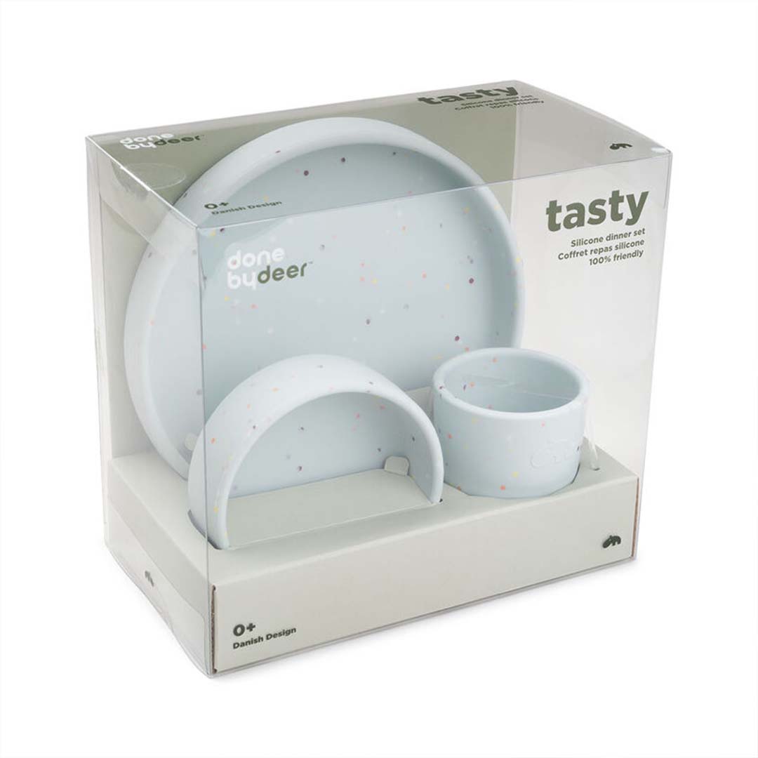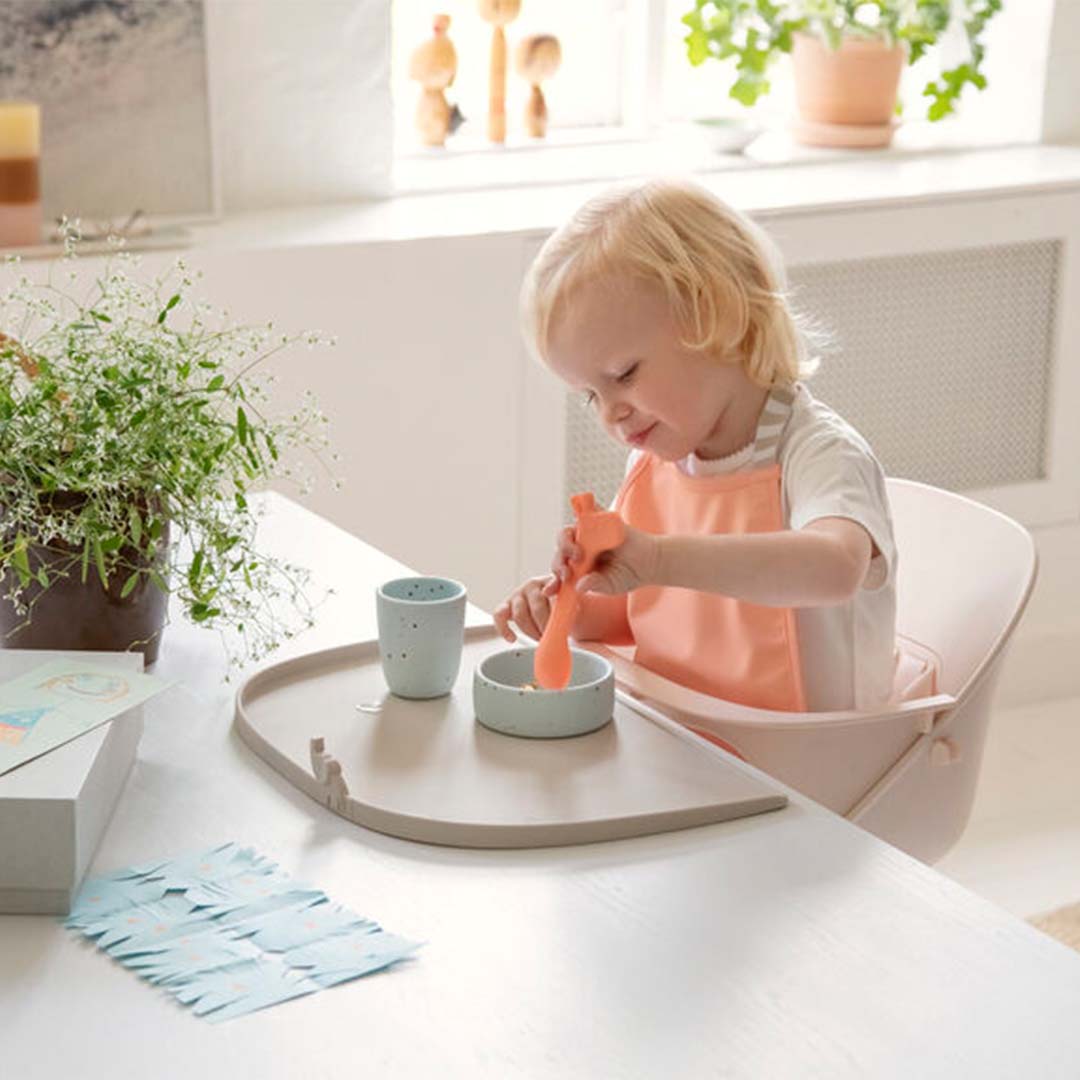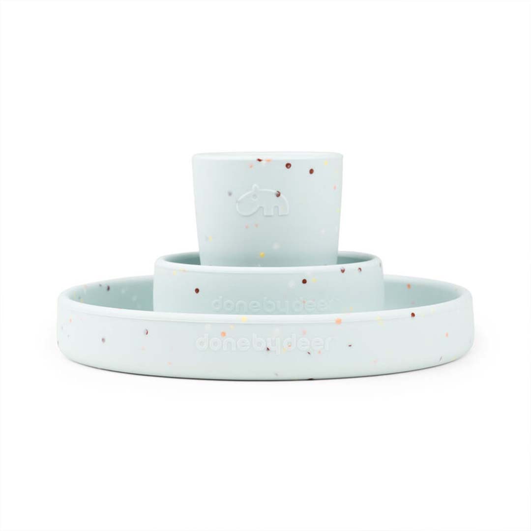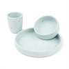 Silikon första måltidsset med konfetti gör dukningen extra rolig. Det praktiska startsetet i silikon har halkskydd är lätt att greppa för de små händerna, setet inkluderar en tallrik, en skål och en minimugg. Perfekt som present eller gåva till 1-åringen.