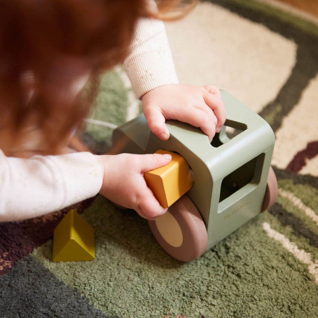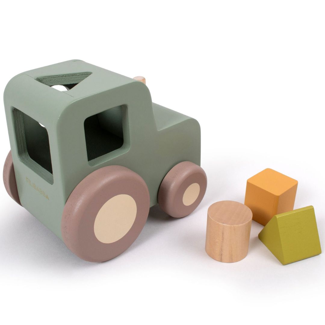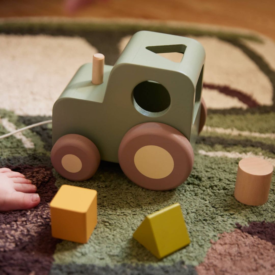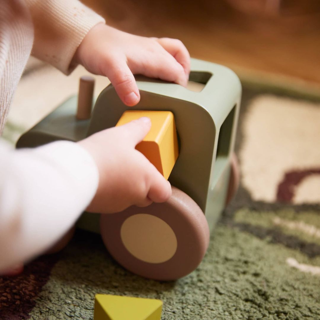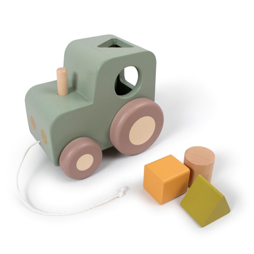 Två av de mest älskade babyleksakerna; dragleksaken och plocklådan kombinerade i en. Den lilla traktorn kommer att älska att följa med barnet runt i hemmet. En plocklåda är en riktig klassiker som inte bör saknas i något barnrum, eftersom den stimulerar koordinationen mellan hand och öga, finmotoriken och problemlösningsförmågan - samtidigt som man har roligt. En pull-along-leksak uppmuntrar barnet att gå och hjälper till att utveckla motoriken eftersom barnet både måste greppa tag i snöret och dra samtidigt.