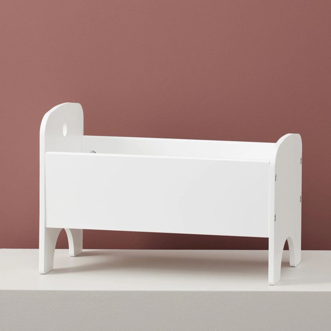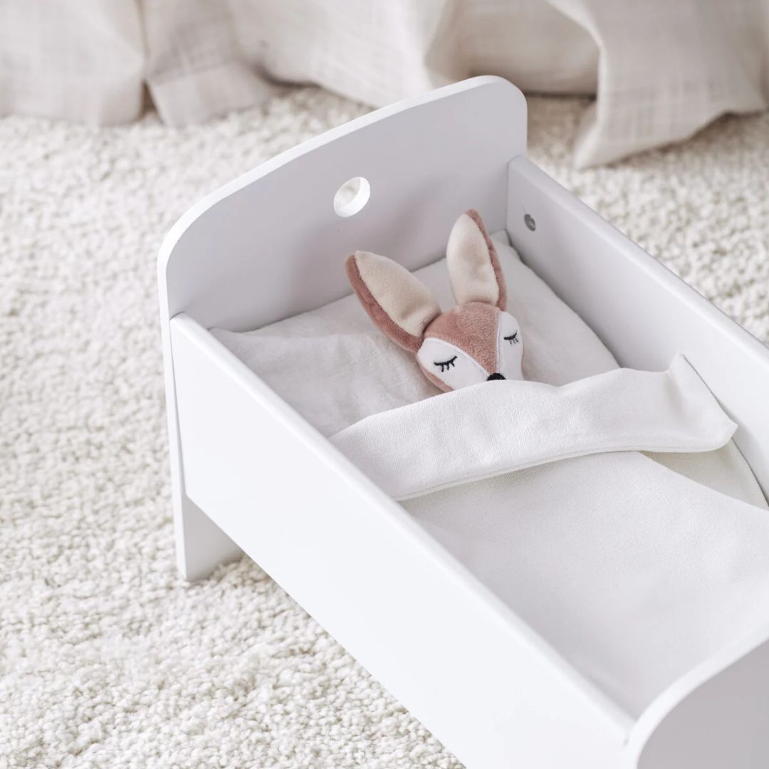 Docksäng i STAR konceptet inklusive bäddset och kudde i 100% bomull. Fyllning i kudden i 100% polyester. I vitt målat MDF trä. Innermått L30-35 x B20 cm. MDF,100% Bomull,100% Polyester Säng: MDF. Textil: Bomull. Fyllning kudde: Polyester. EN71 Tillverkad av FSC-certifierat trä CE-märkt Bäddset: Handtvätt. Trä: Rengör med fuktig trasa. Torka torrt med en ren trasa. Kontrollera regelbundet att alla skruvar är väl åtdragna, samt att alla delar är intakta. Handtvätt,Ej torktumling