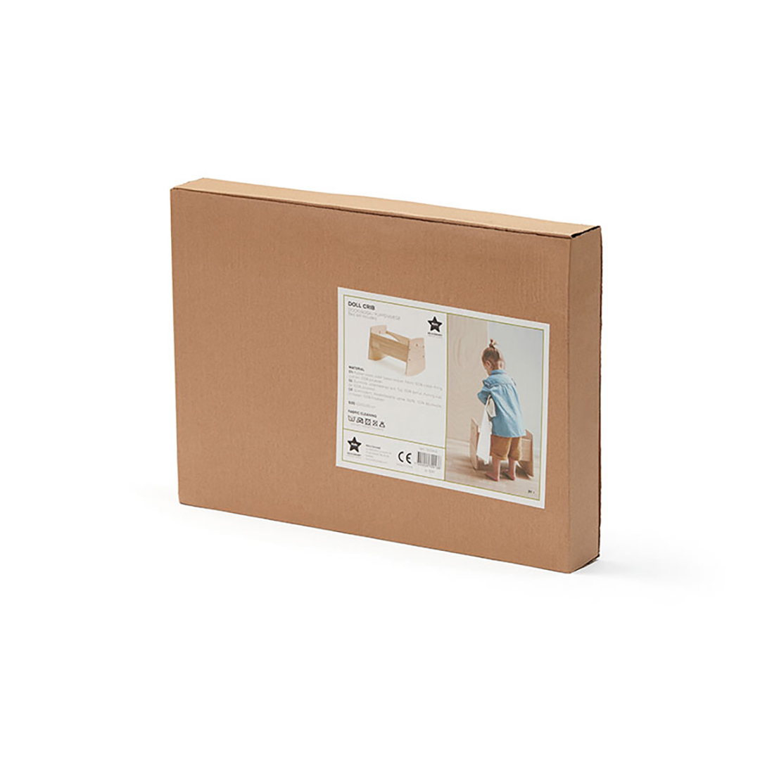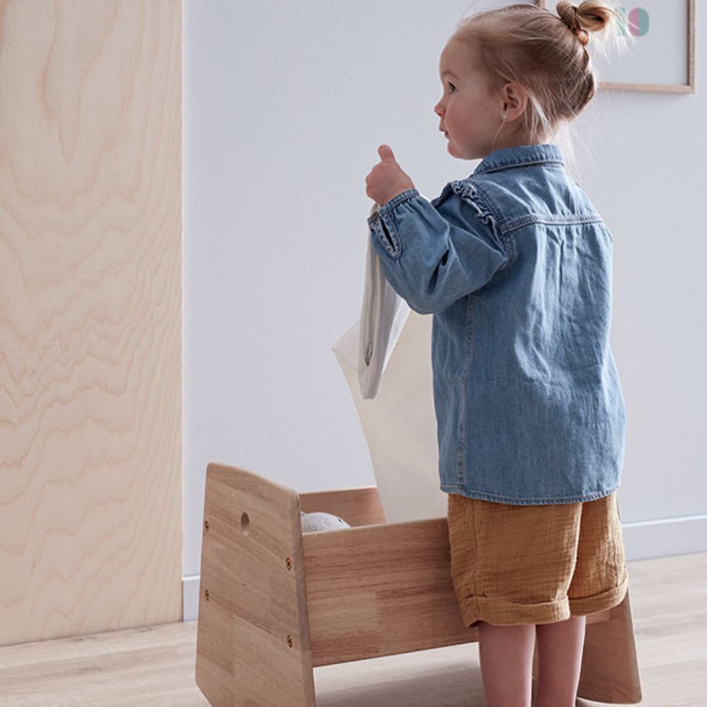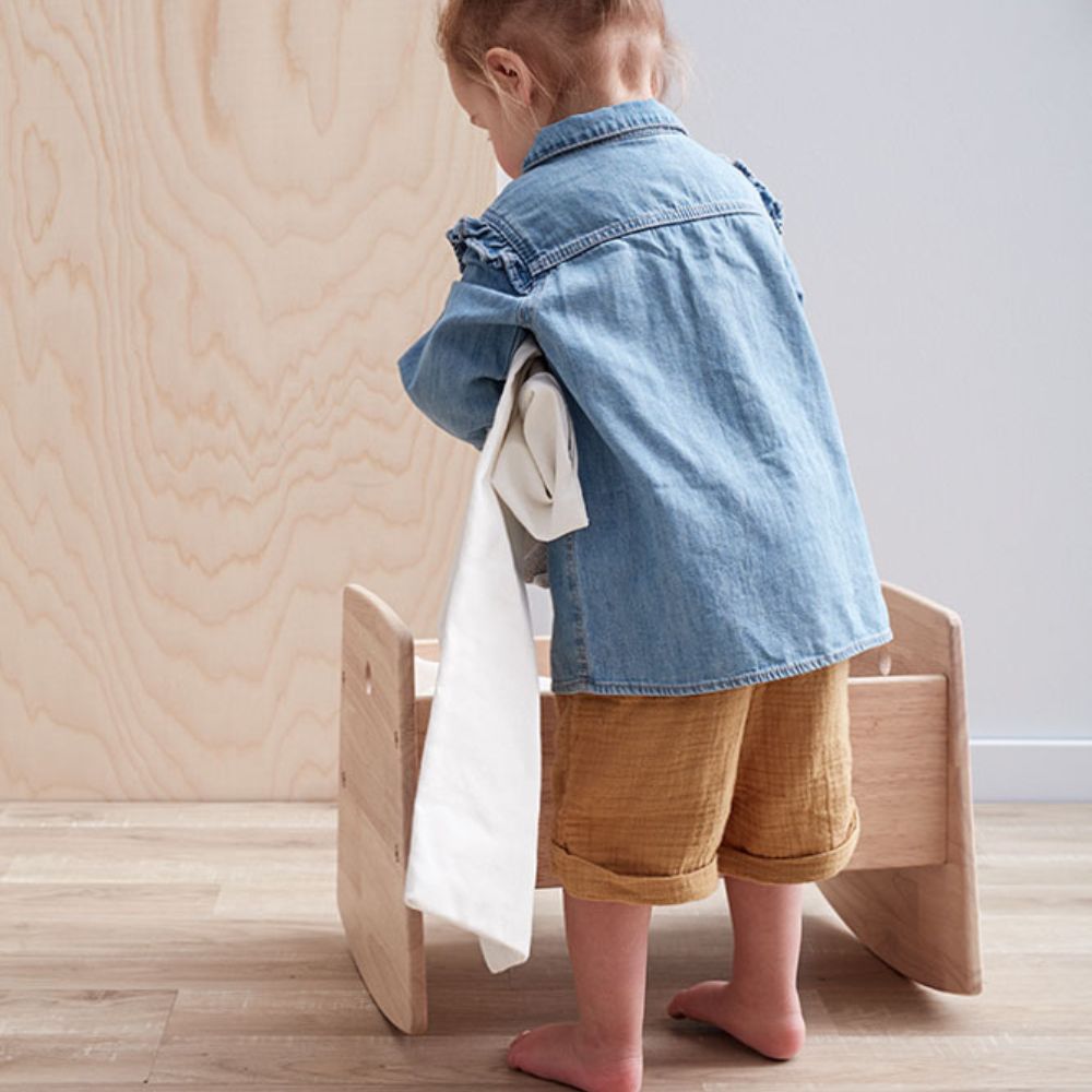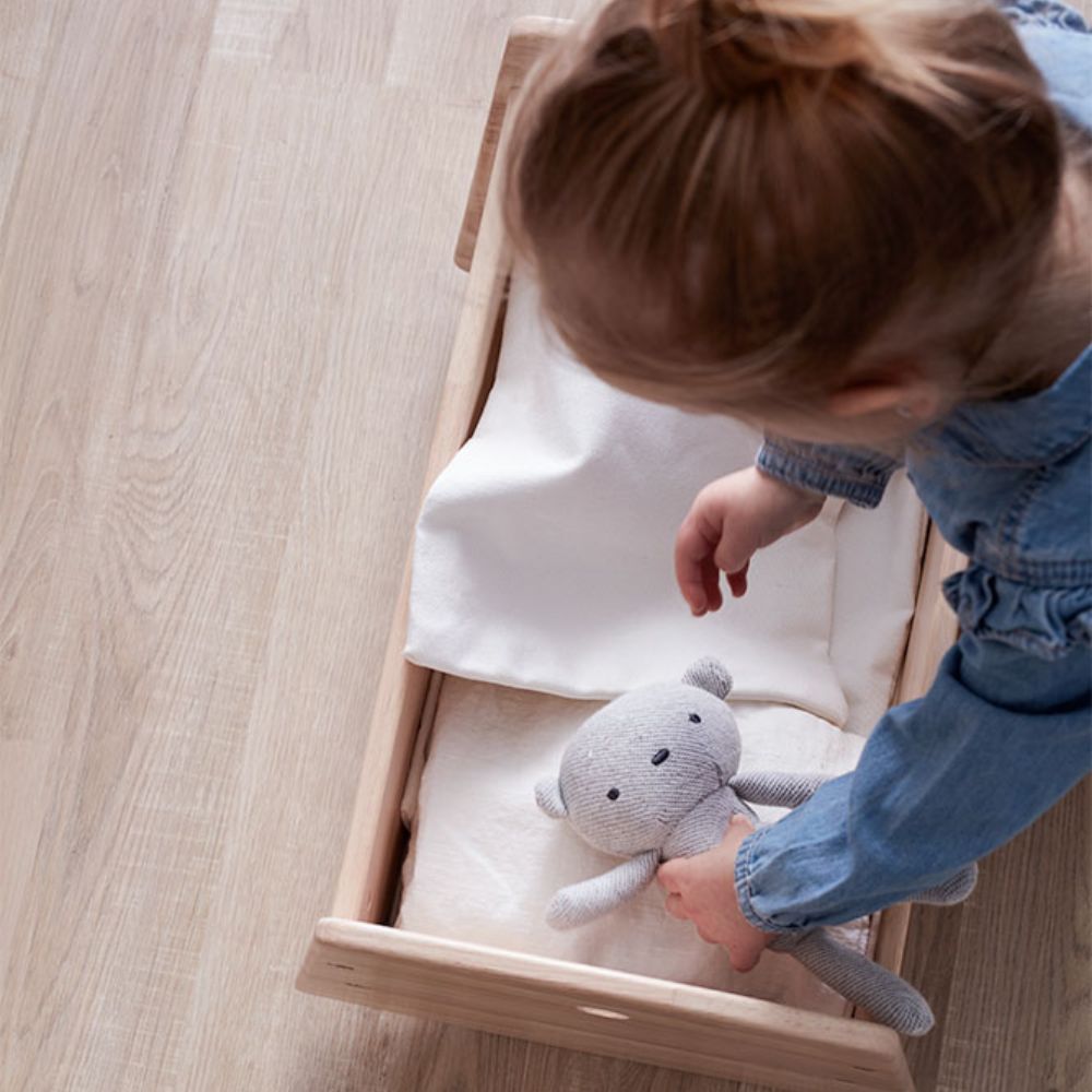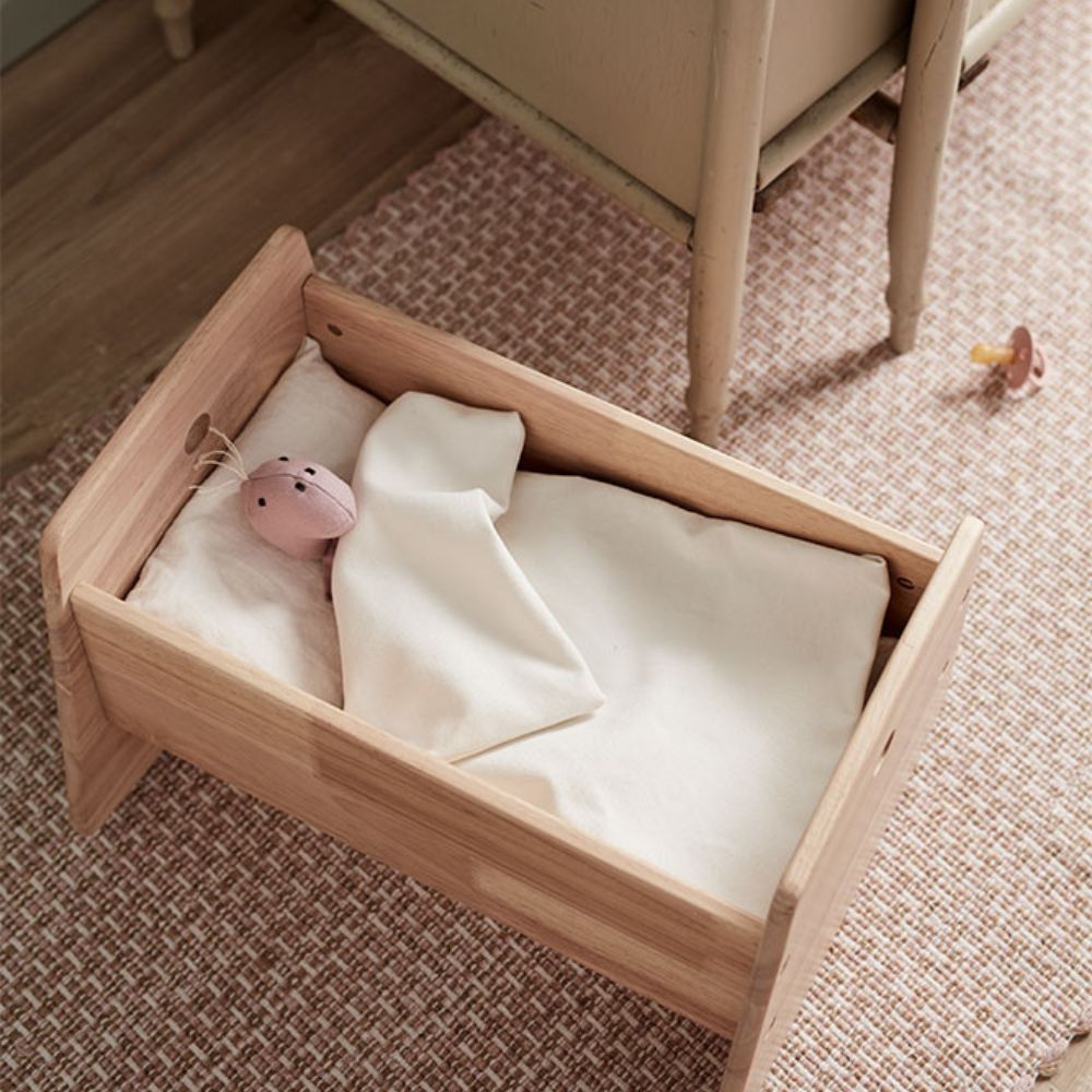 Lakan och täcke sitter ihop, kudde för sig ingår i 100% bomull ingår så dockan blir ordentligt omstoppad. I gummiträ.