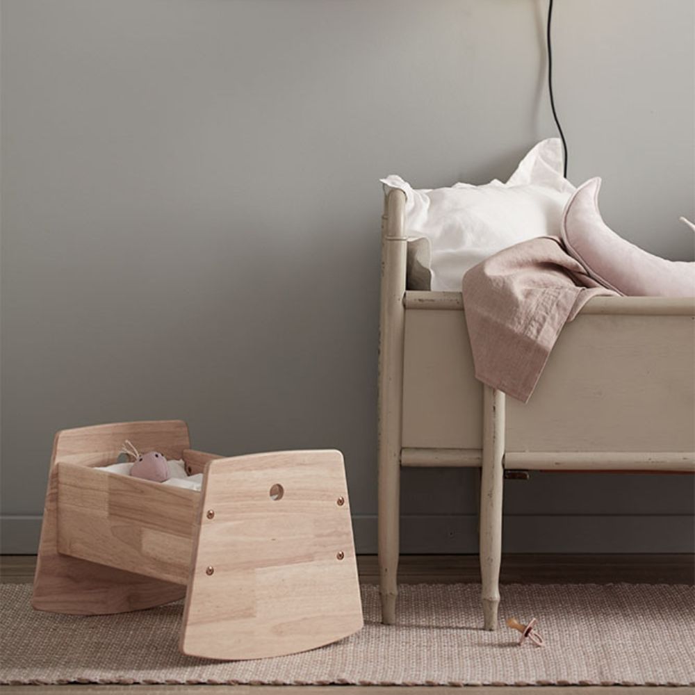 Vagga: Gummiträ. Botten: Plywood. Textil: Bomull. Fyllning kudde: Polyester. EN71 Tillverkad av FSC-certifierat trä CE-märkt Bäddset: Handtvätt. Trä: Rengör med fuktig trasa. Torka torrt med en ren trasa. Kontrollera regelbundet att alla skruvar är väl åtdragna, samt att alla delar är intakta. Handtvätt,Ej torktumling