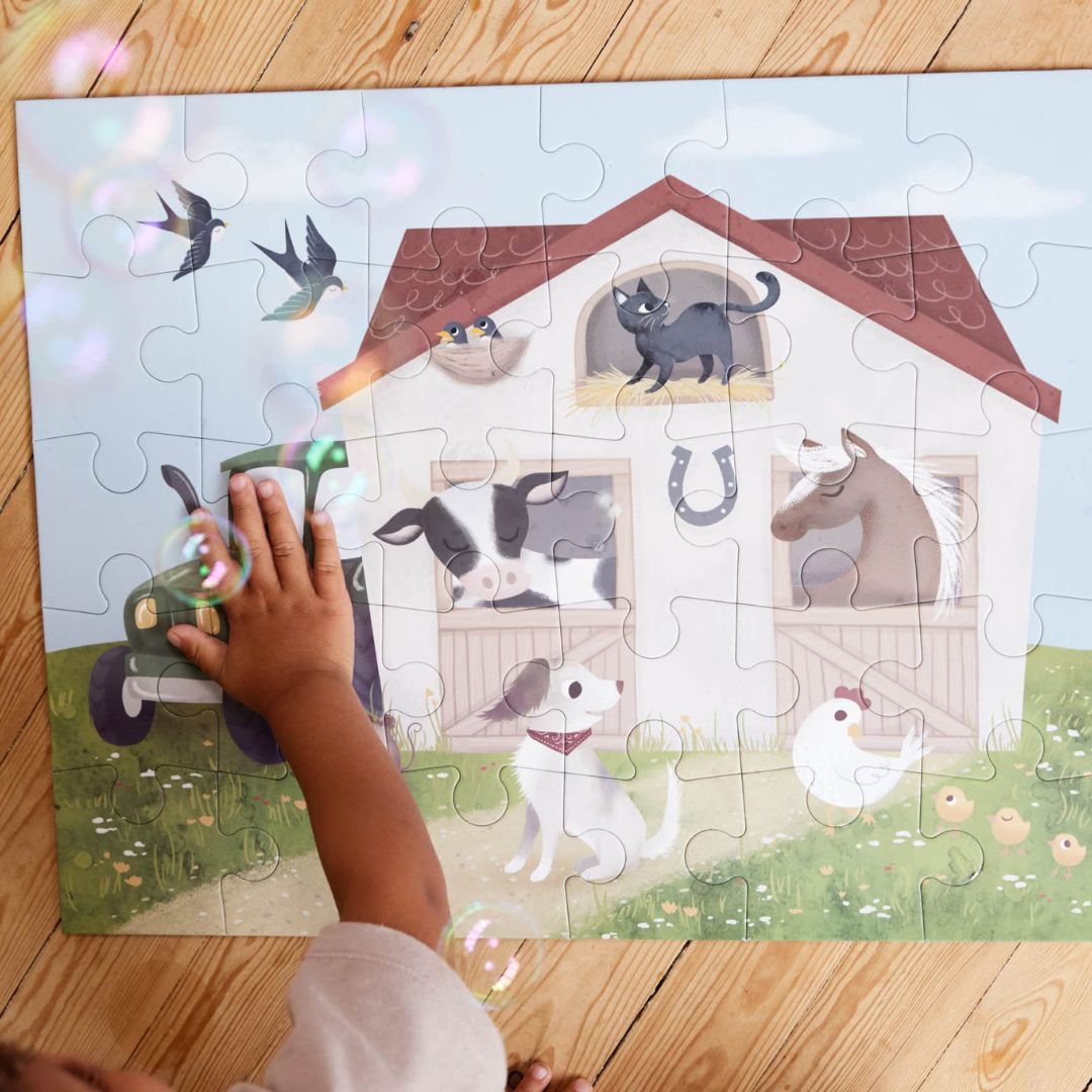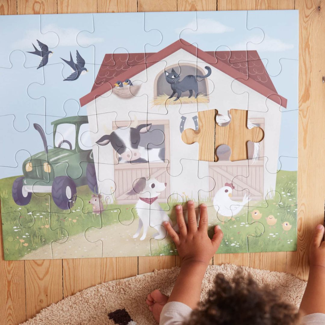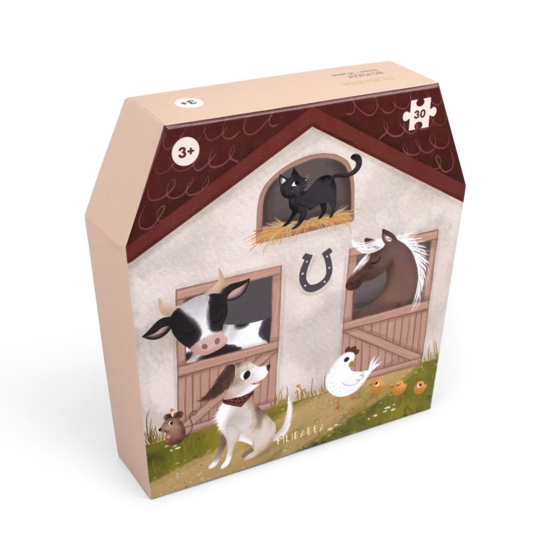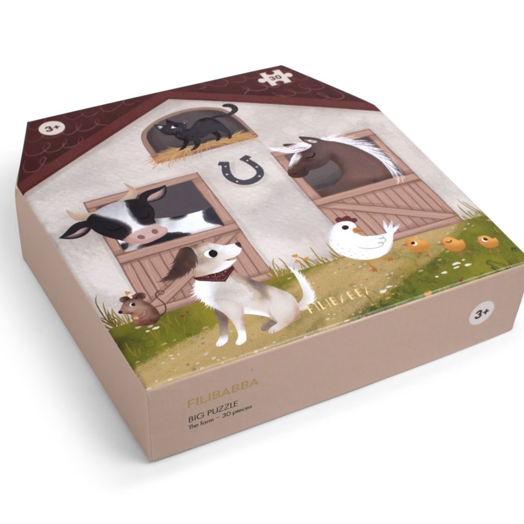 Stort golvpussel med 30 bitar och en halvmeter stort! Tillfredsställelsen av att lägga den sista pusselbiten på plats är tidlös. Med Filibabbas pussel kan ditt barn stärka sin finmotorik och samtidigt lära sig om bondgårdsdjuren. Det stora pusslet innehåller 30 stora bitar med en färgstark handritad illustration som föreställer en lada full av söta bondgårdsdjur. Pusslet levereras i en låda som är formad som en lada och som ser dekorativ ut när den inte används.