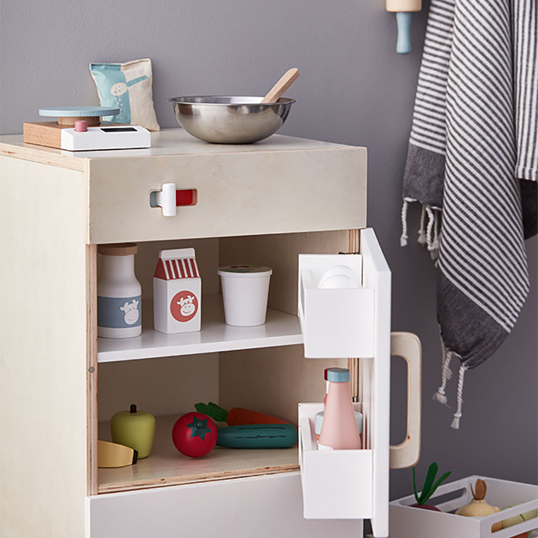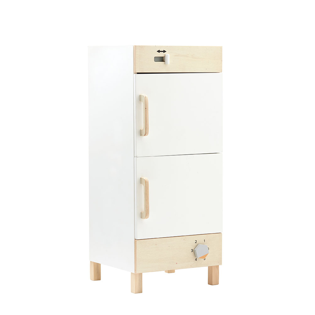 Kyl och frys kombiskåp. Med två hyllor och en ägghållare inuti och en låda i botten för sallad och frukt. Vridbart vred för temperaturen och Kylskåpet blir utan tvekan bli en hit eftersom barnen vill göra det vi gör. Skåpet är tillverkad av trä och har två separata handtag och dörrar som kan öppnas var för sig.