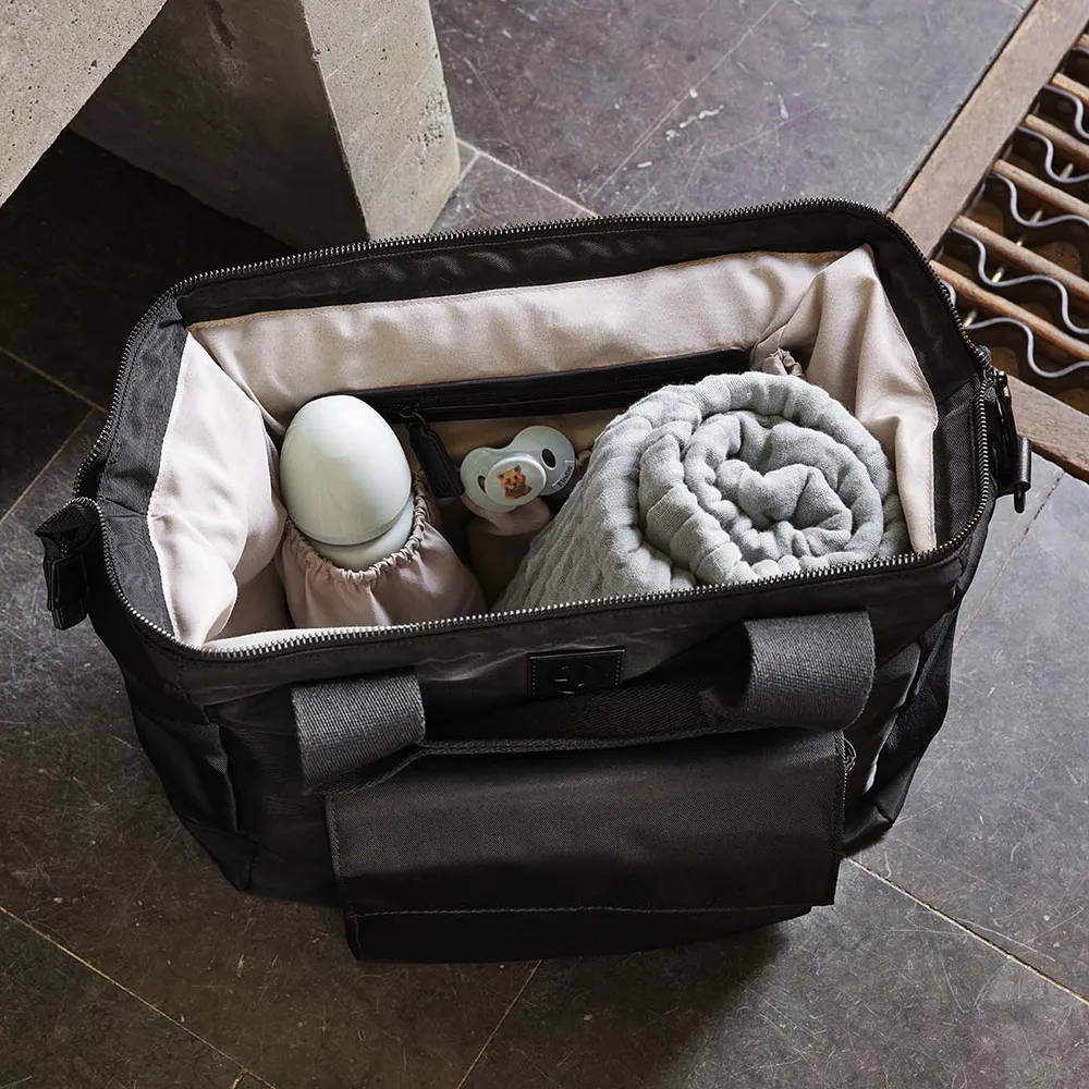 Skötväskan är designad med mängder av fack och fickor, anpassade för blöjor, våtservetter, nycklar, mobil och plånbok. En särskild isolerad termosficka håller vällingflaskan upprätt och varm, eller er egen dryck kall.