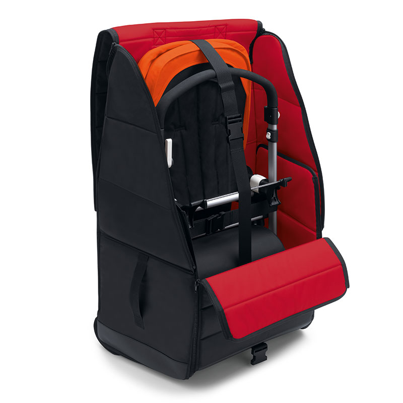 I transportväskan från Bugaboo finns det separata fack för swivelhjulen, utrymme för parasoll och några extra fack där du kan lägga andra saker.