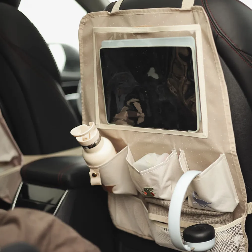 Med en surfplattehållare, nätfickor, tre förvaringsfickor och en rem för hörlurar finns det gott om plats för allt från snacks till leksaker. Tillverkad av slitstarkt 600D oxford polyestertyg i återvunnen kvalitet, vilket gör den både hållbar och snygg.