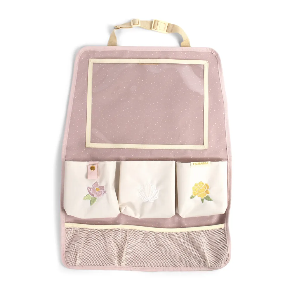 Med en surfplattehållare, nätfickor, tre förvaringsfickor och en rem för hörlurar finns det gott om plats för allt från snacks till leksaker. Tillverkad av slitstarkt 600D oxford polyestertyg i återvunnen kvalitet, vilket gör den både hållbar och snygg.