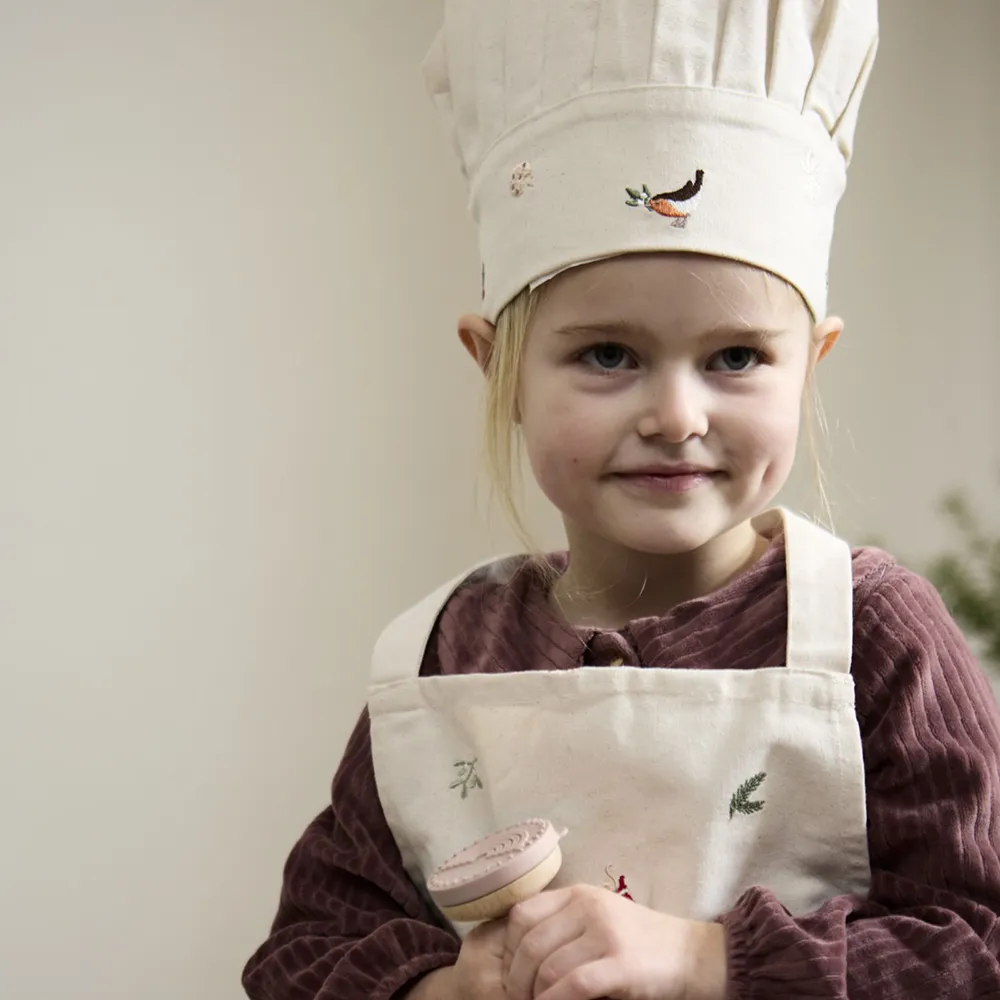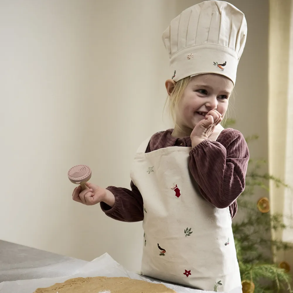 Julbageriet är öppet! Med detta fina set som inkluderar ett förkläde och en kockmössa är ditt barn redo att skapa fantastiska kakor och tårtor. Perfekt för både lek och verkliga köksäventyr. Setet är tillverkat av ofärgad, GOTS-certifierad ekologisk bomull, vilket gör det till ett miljövänligt val som ger glädje för små bagare. Förklädet och mössan är dekorerade med vackra vinterinspirerade broderier och är ett utmärkt komplement till vår populära kakstämpel.